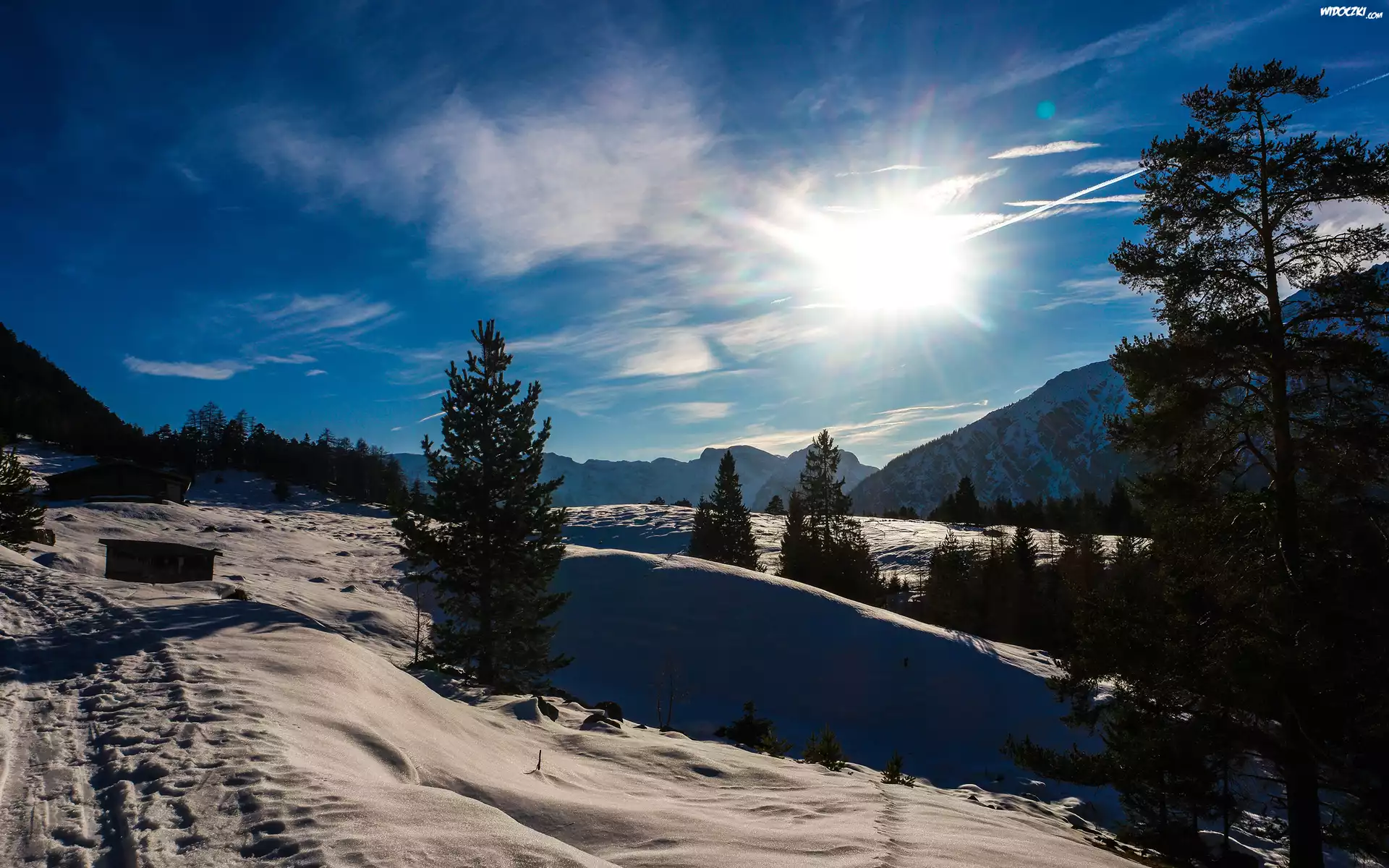 Zima, Góry, Drzewa, Promienie słońca