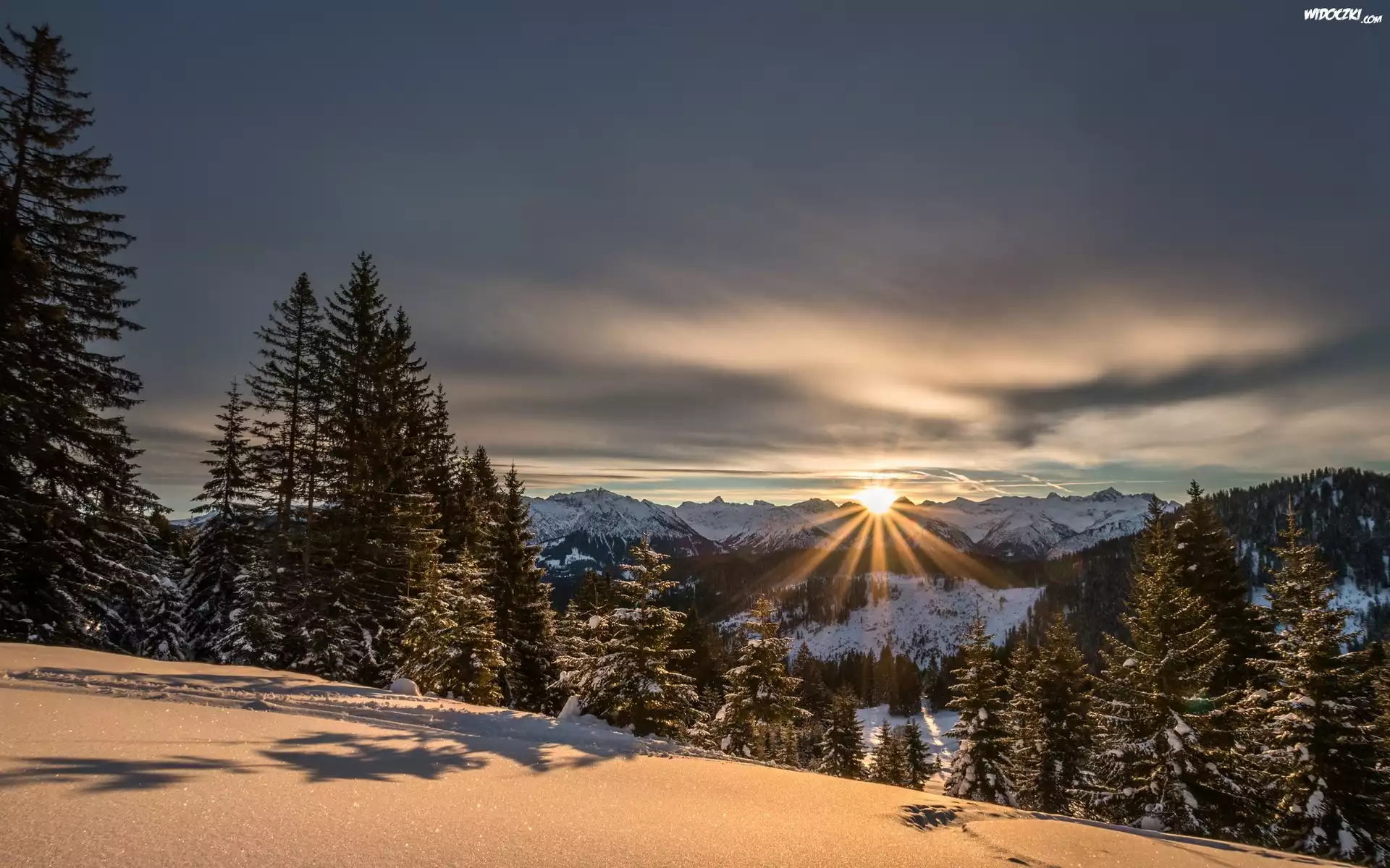 Zdjęcia, Zima, Góry, Drzewa, Las, Promienie słońca