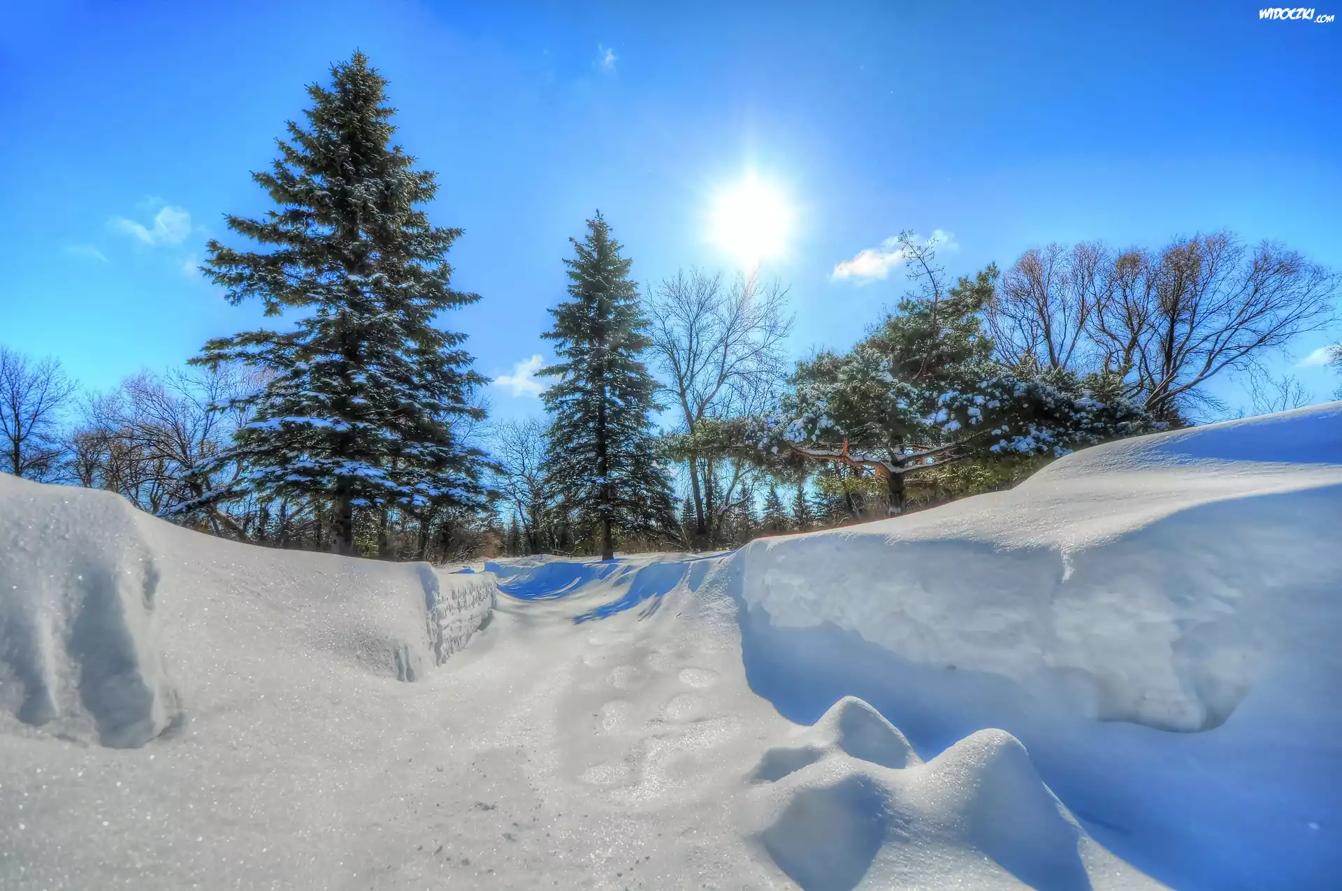 Zdjęcia, Zima, Park, Drzewa, Promienie słońca