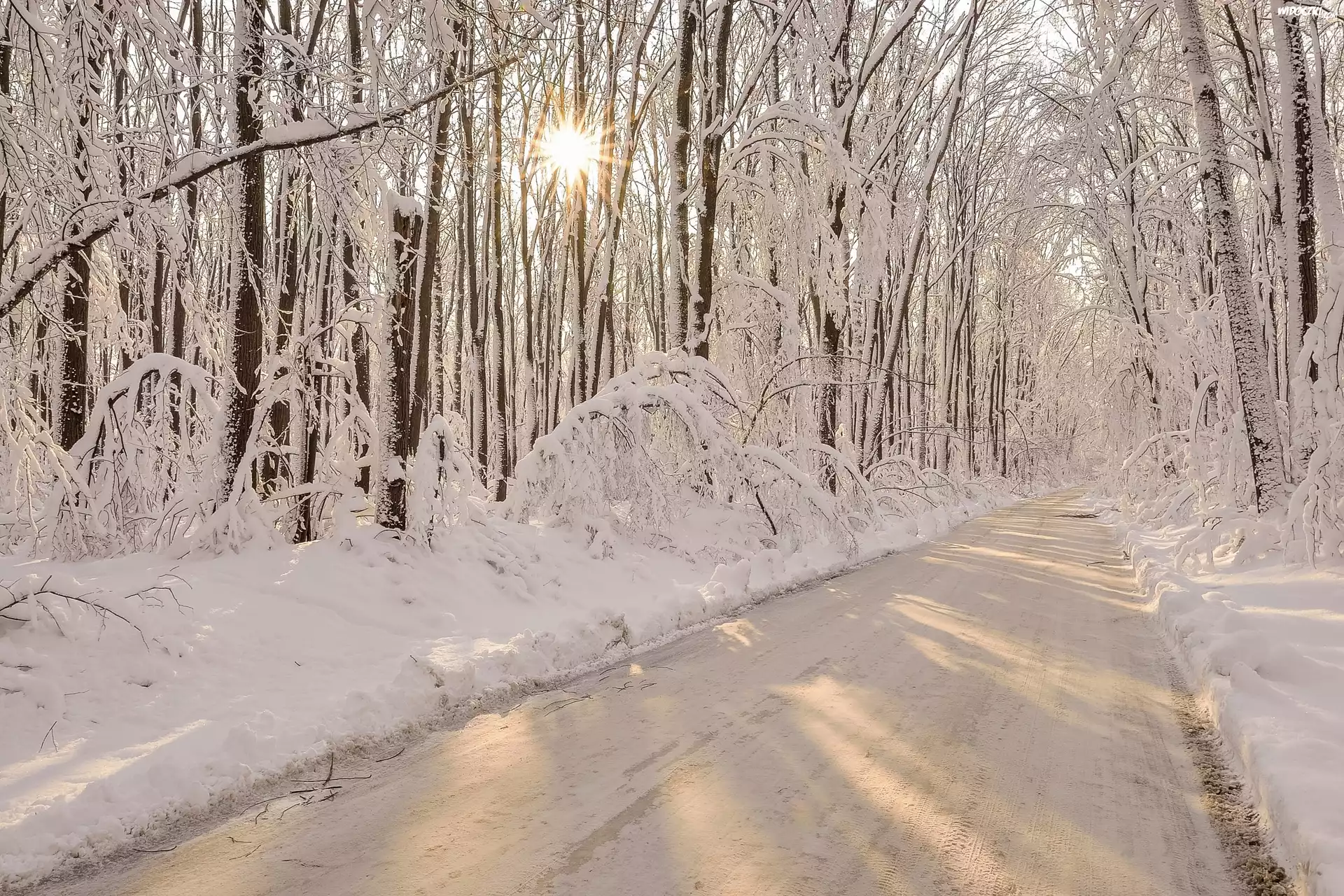 Zdjęcia, Zima, Droga, Las, Promienie, Słońca