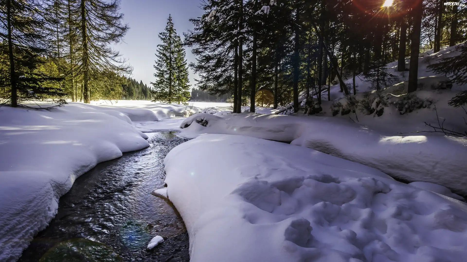 Zdjęcia, Zima, Rzeczka, Las, Promienie Słońca