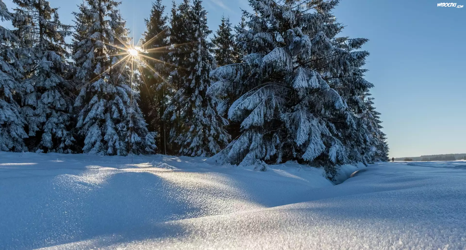 Zdjęcia, Zima, Drzewa, Świerki, Promienie słońca