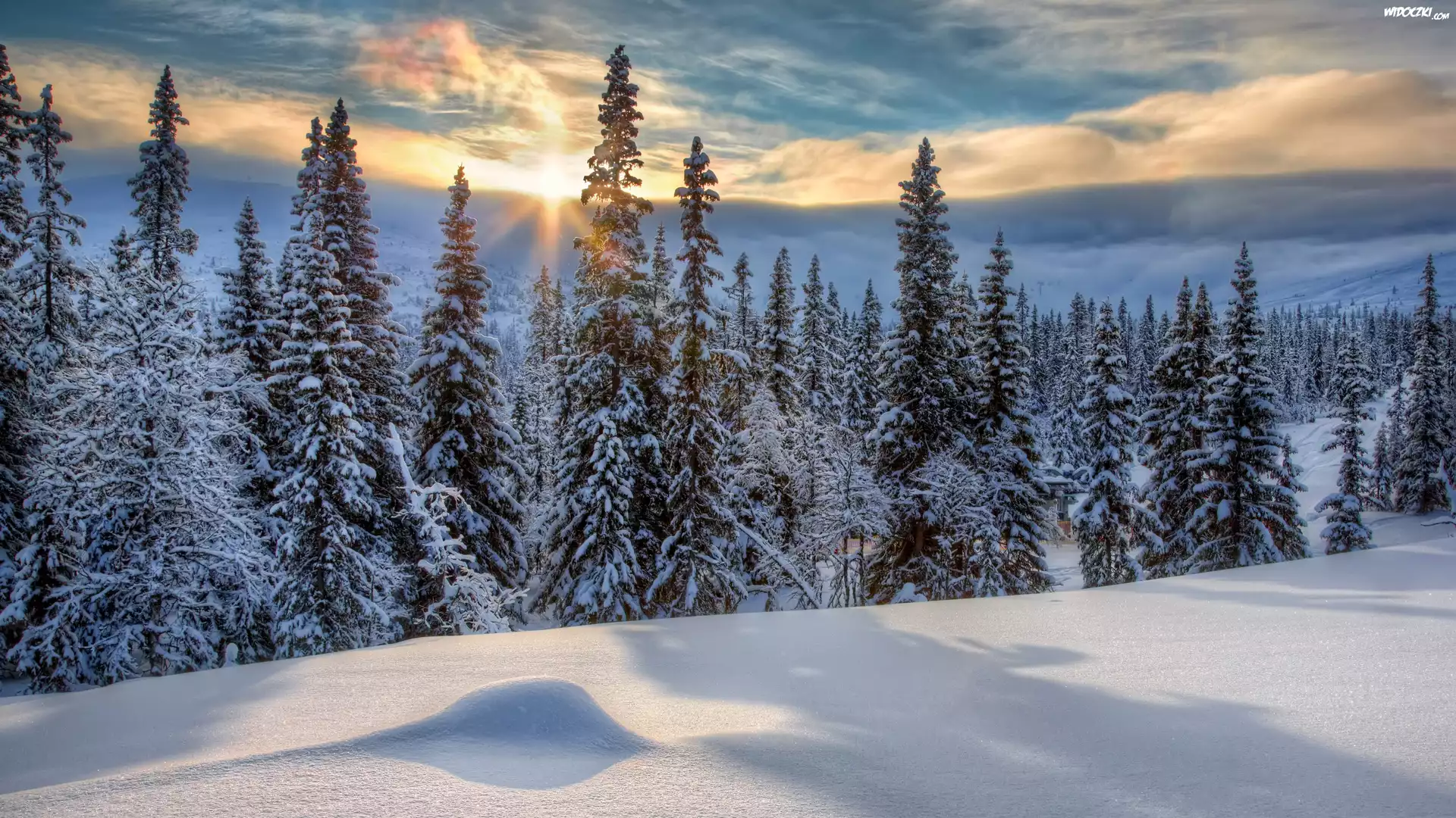 Zdjęcia, Zima, Las, Świerki, Promienie słońca