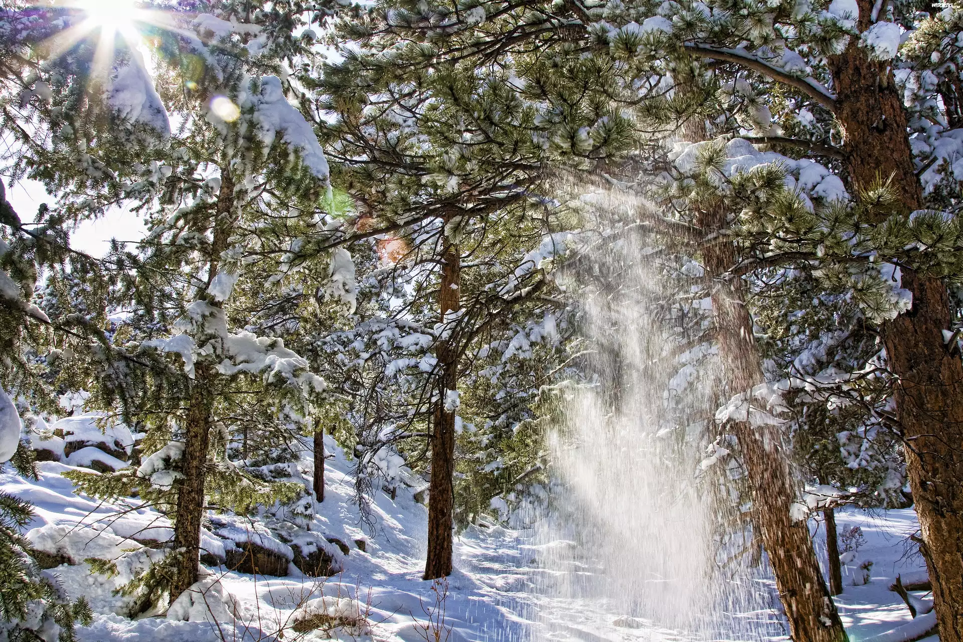 Zima, Las, Promienie, Słońca, Prószący, Śnieg