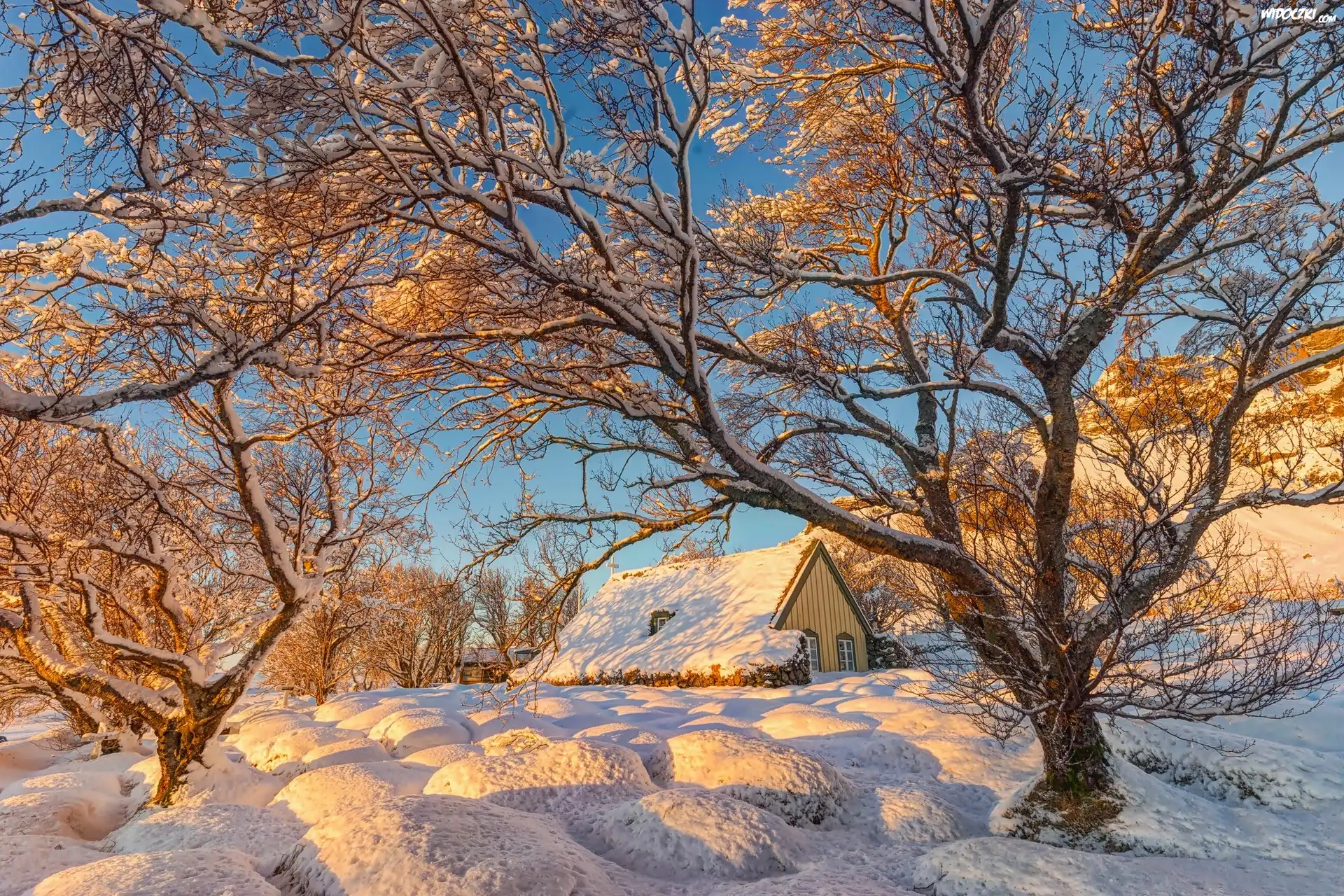 Zdjęcia, Zima, Drzewa, Dom, Przebijające światło