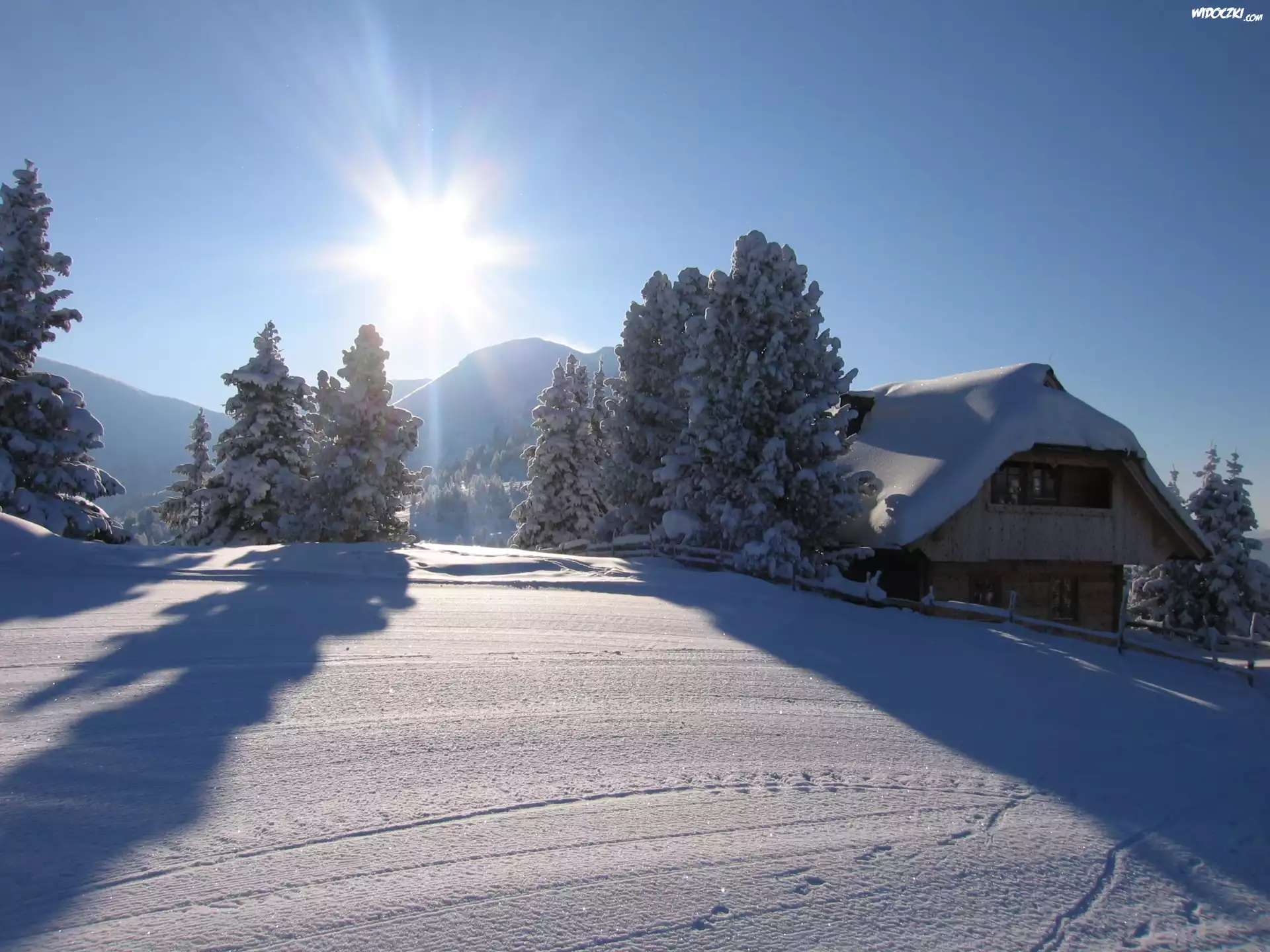 Zdjęcia, Zima, Ośnieżone, Drzewa, Dom, Przebijające, Światło