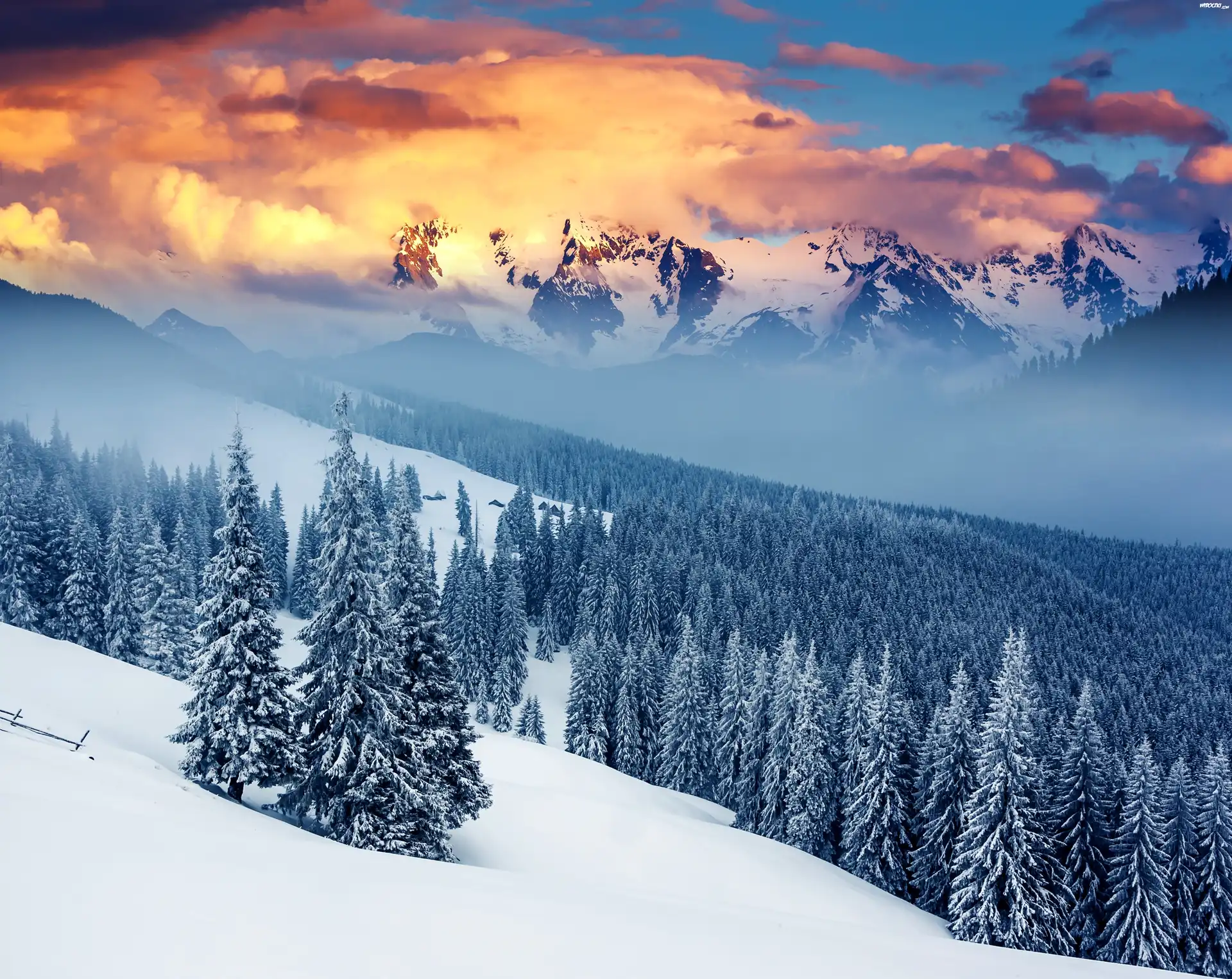Zima, Góry, Mgła, Drzewa, Przebijające, Światło