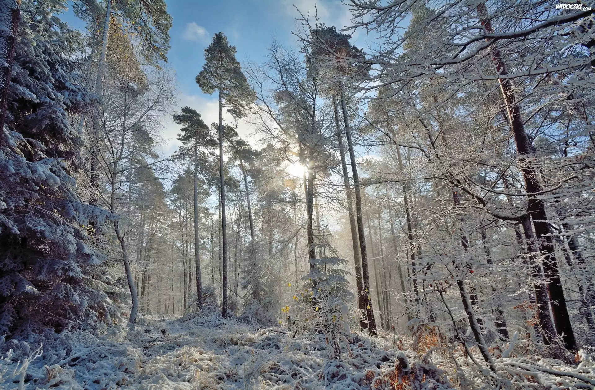 Zdjęcia, Zima, Las, Oszronione, Drzewa, Przebijające światło