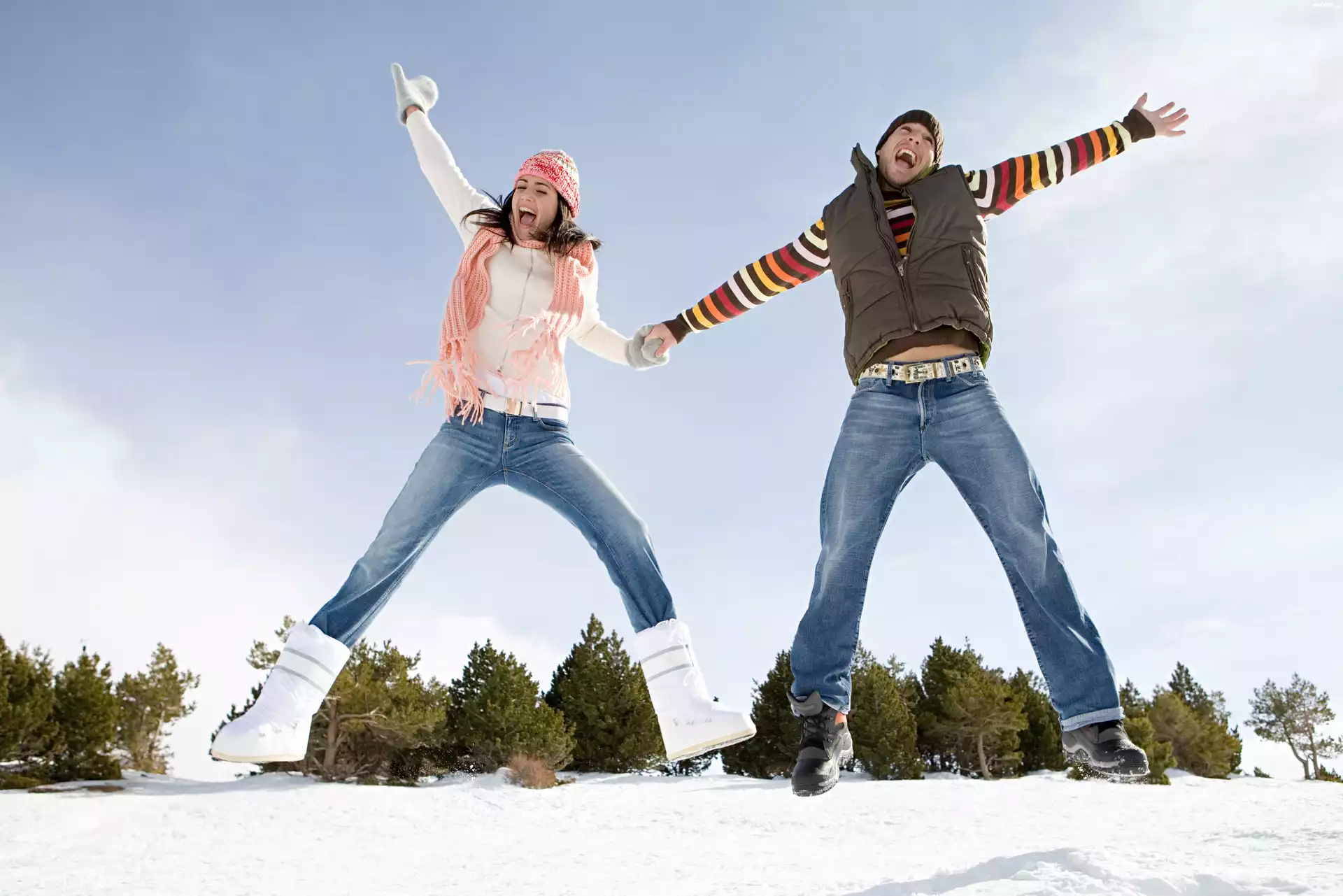 Zdjęcia, Zima, Śnieg, Para, Drzewa, Radość, Niebo