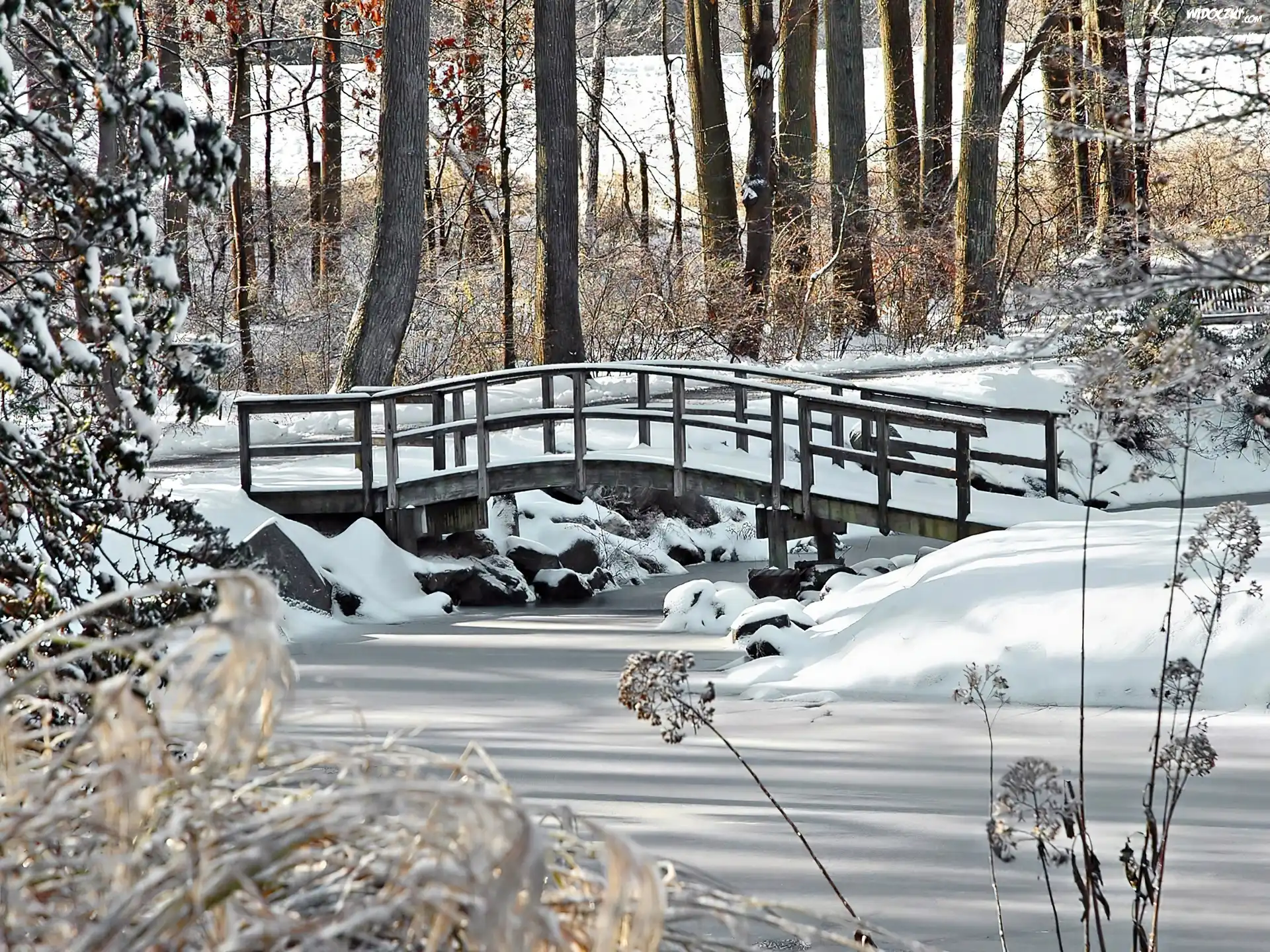 Zdjęcia, Zima, Zamarznięta, Rzeczka, Mostek
