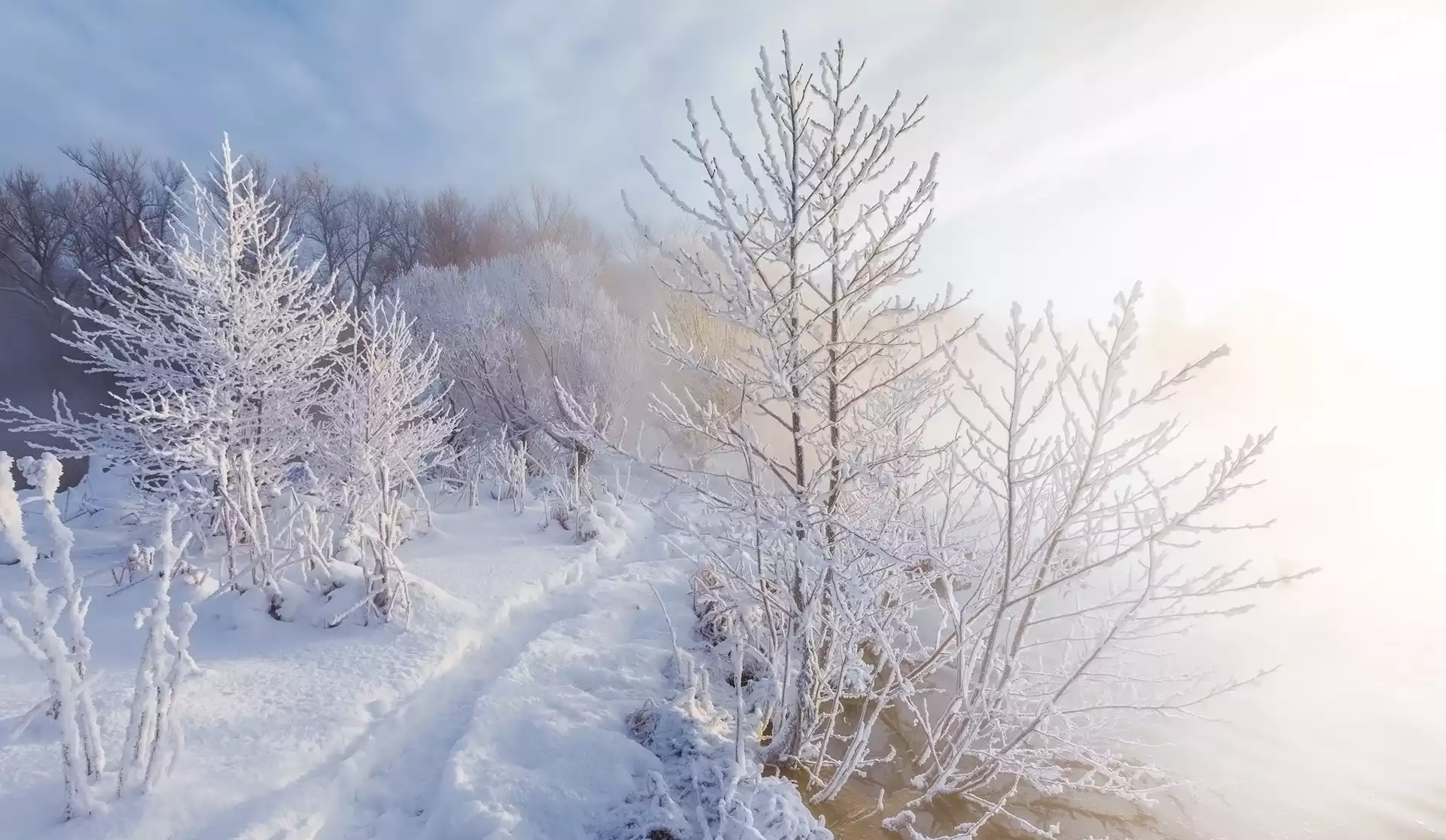 Zdjęcia, Zima, Drzewa, Dróżka, Rzeka, Mgła