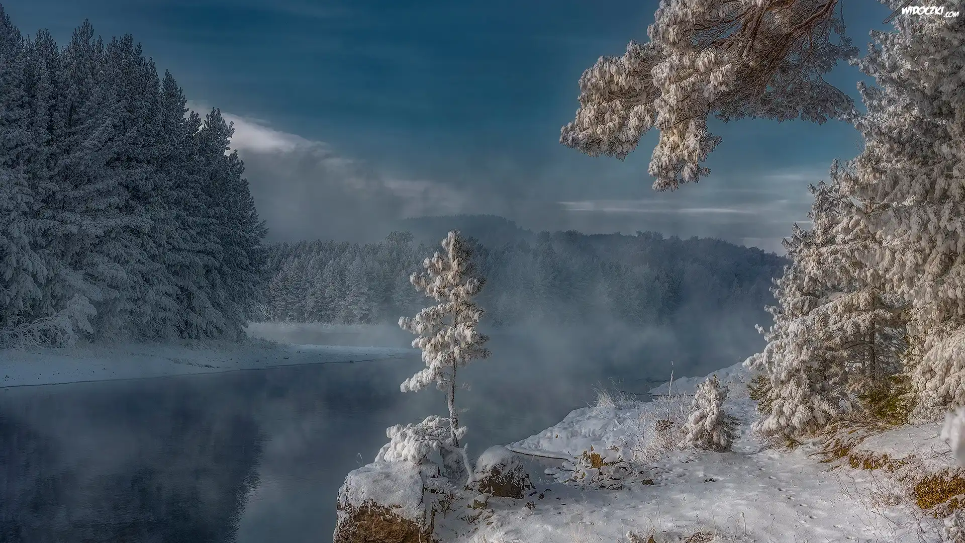 Zima, Śnieg, Drzewa, Rzeka, Mgła