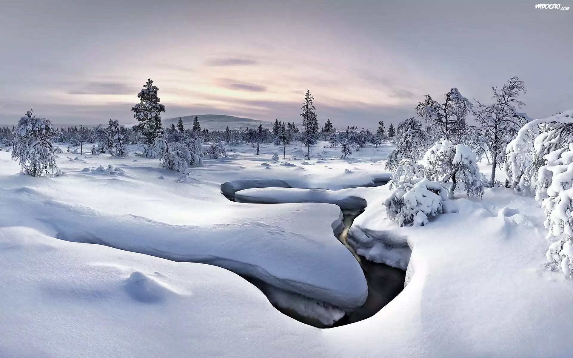 Zima, Śnieg, Góry, Las, Rzeka, Drzewa