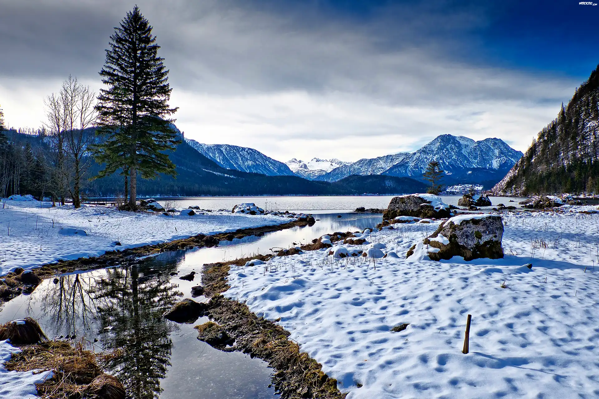 Zdjęcia, Zima, Góry, Las, Rzeka, Chmury