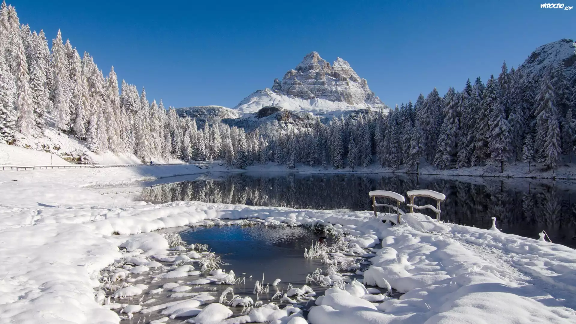 Góry,cztery choinki, śnieg , Zima Wodospad Góry, urwisko Góra, Chmury Góra Drewniany mostek, Zima Zima, Drzewa, Szron, Rzeka Góra Wodospad Góry Chata, Las, Zima, Święta Góra, łąki Leśna, Rzeka, Zima Góra, Niebo Zachód, Słońca, Drzewa, Zima Zima, Biały, Wilk, Wycie