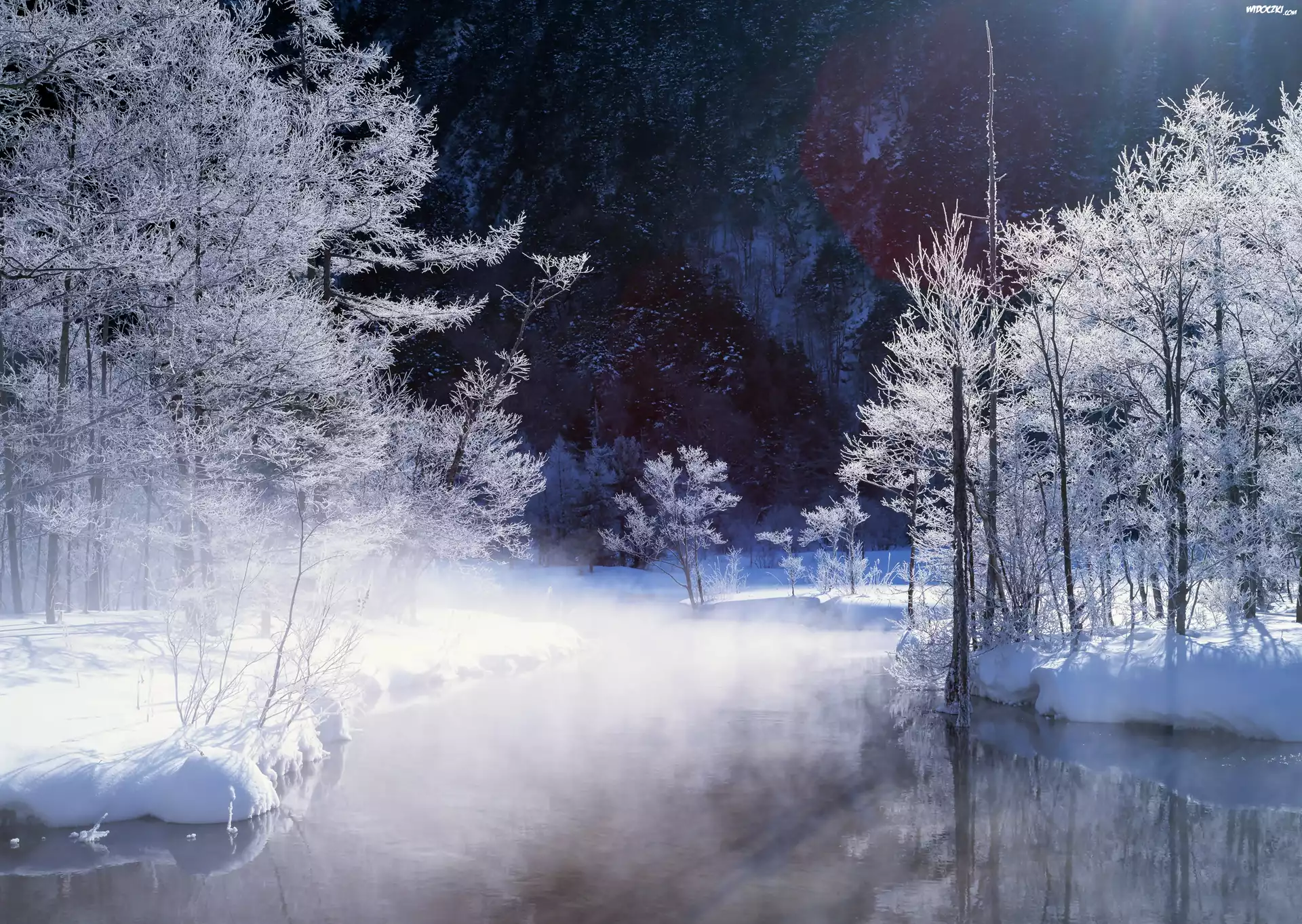 Zdjęcia, Zima, Las, Rzeka, Mgła