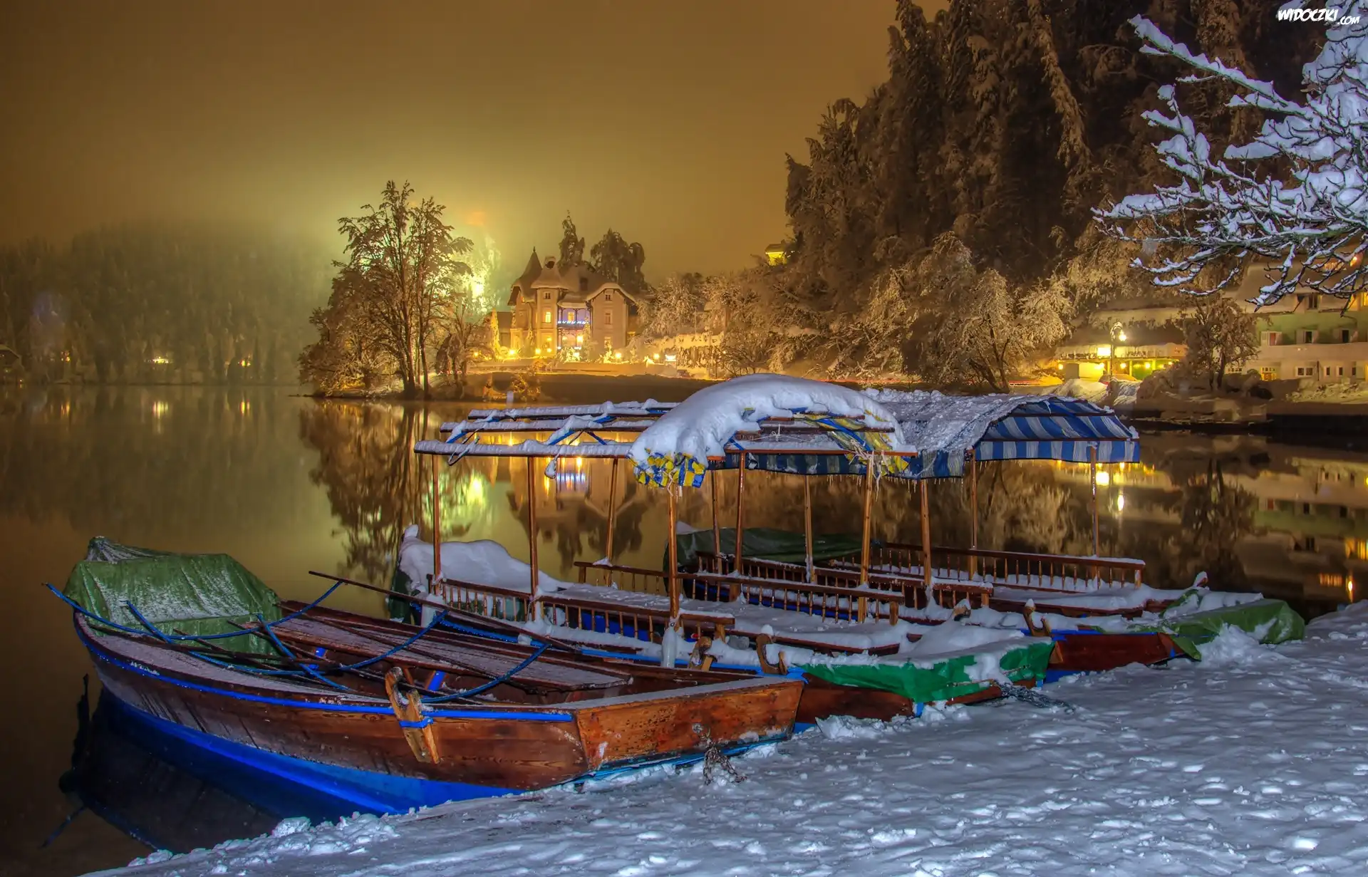 Zdjęcia, Zima, Łodzie, Rzeka, Domy