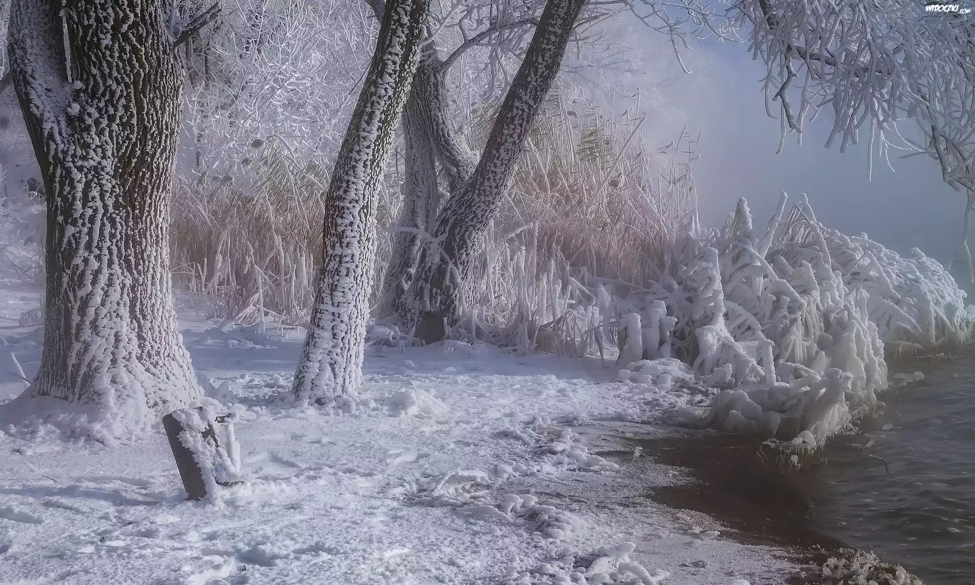 Zdjęcia, Zima, Śnieg, Szron, Drzewa, Rzeka, Trawa