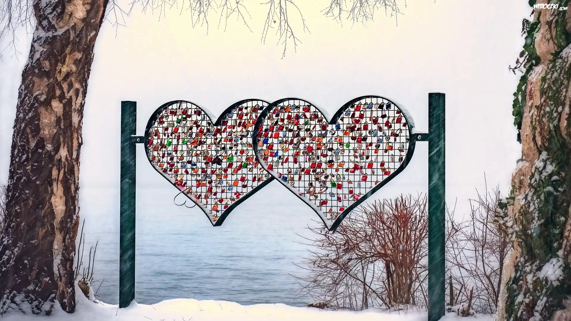 Zdjęcia, Zima, Drzewa, Serca, Kłódki