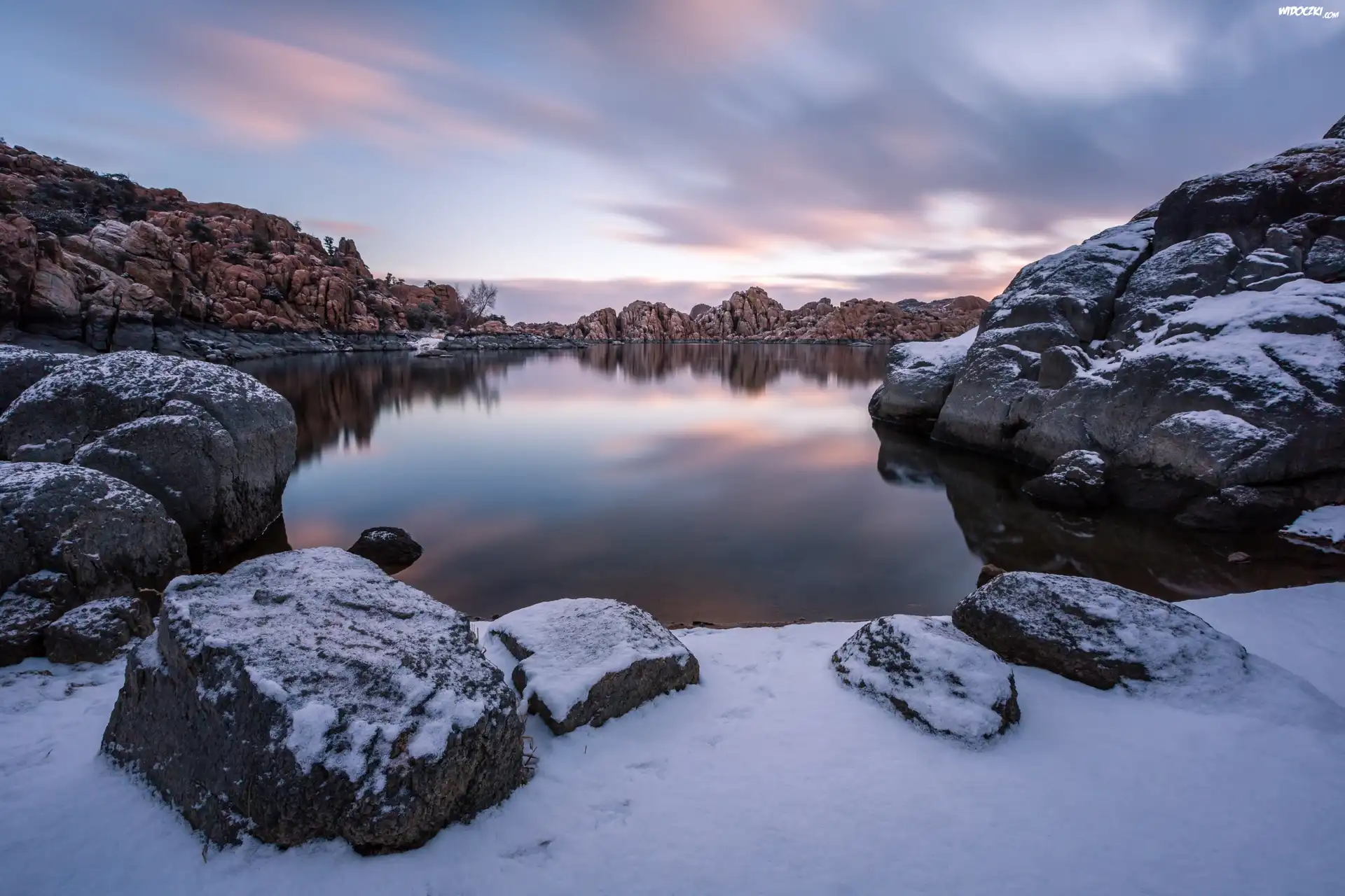Zdjęcia, Zima, Jezioro, Skały, Kamienie