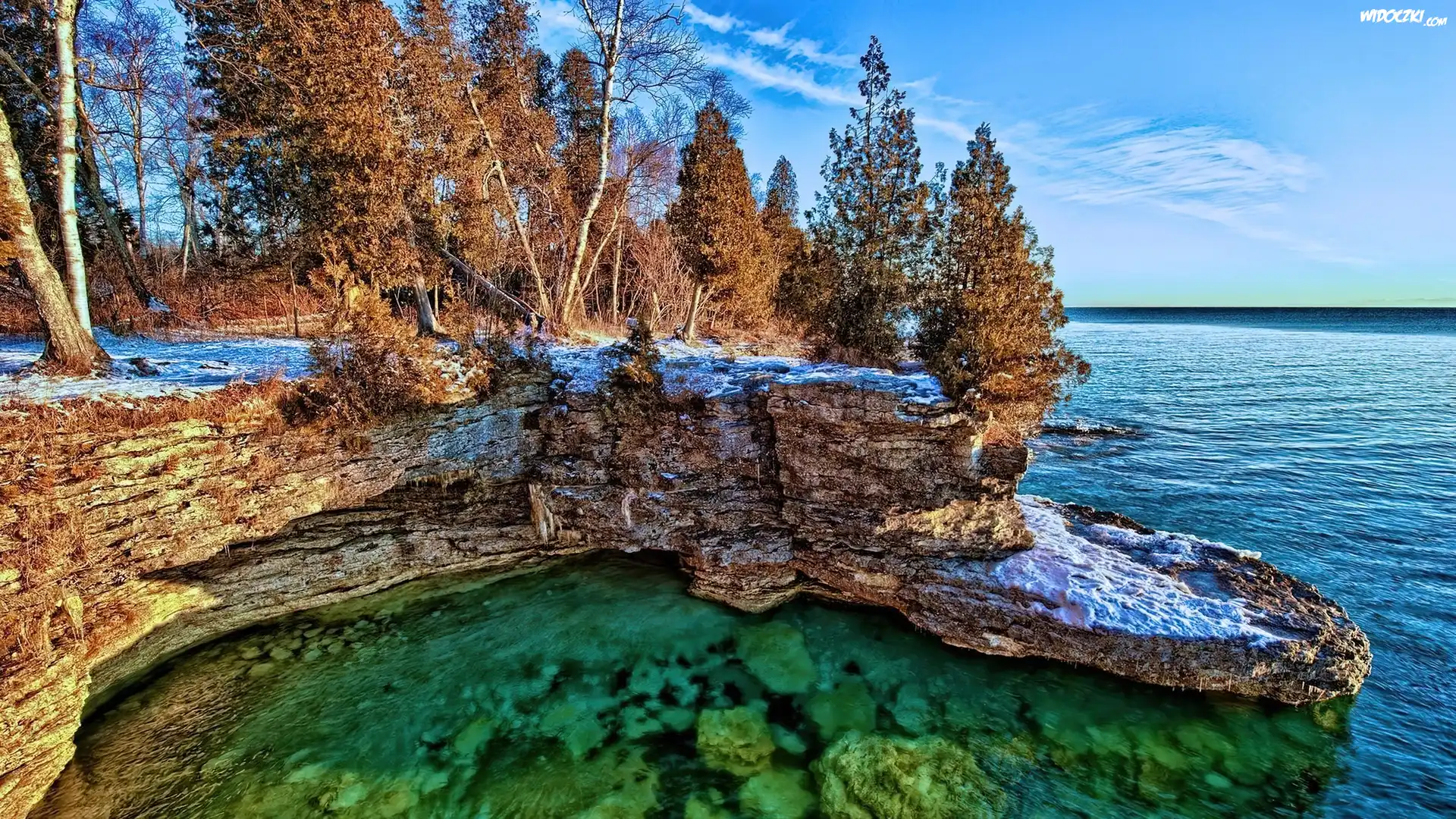 Zdjęcia, Zima, Morze, Skały, Drzewa