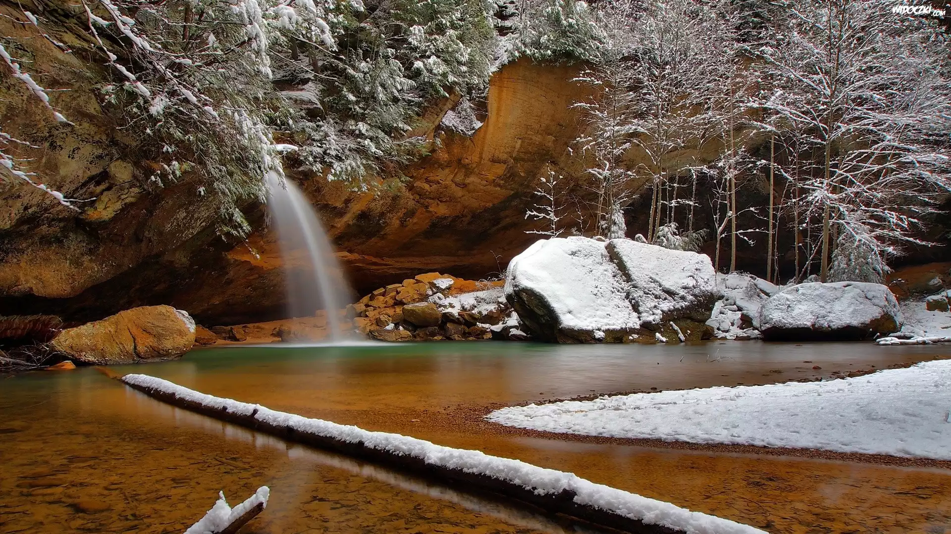 Zdjęcia, Zima, Drzewa, Rzeka, Wodospad, Skały, Kamienie