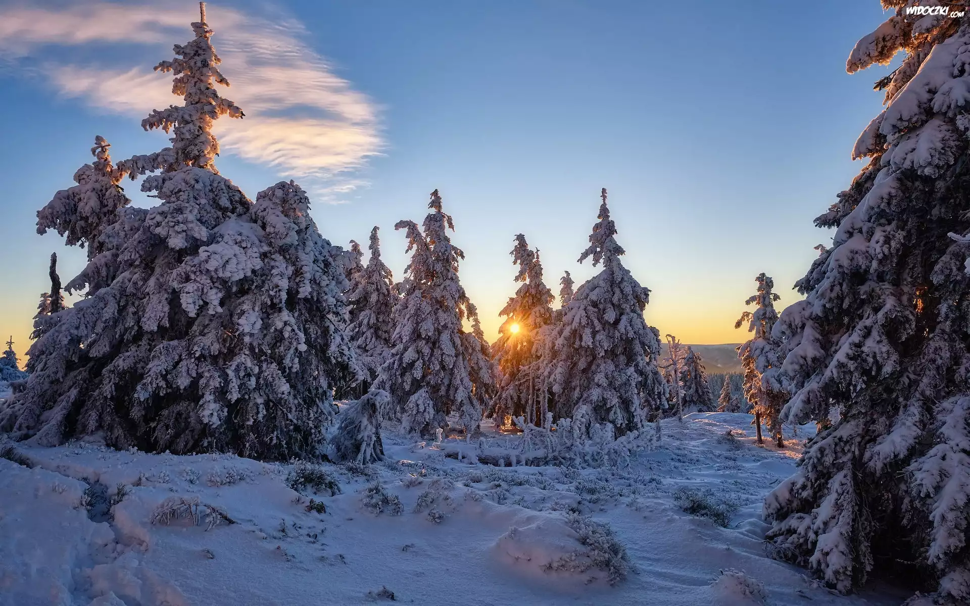 Zdjęcia, Zima, Śnieg, Drzewa, Promienie słońca, Chmura