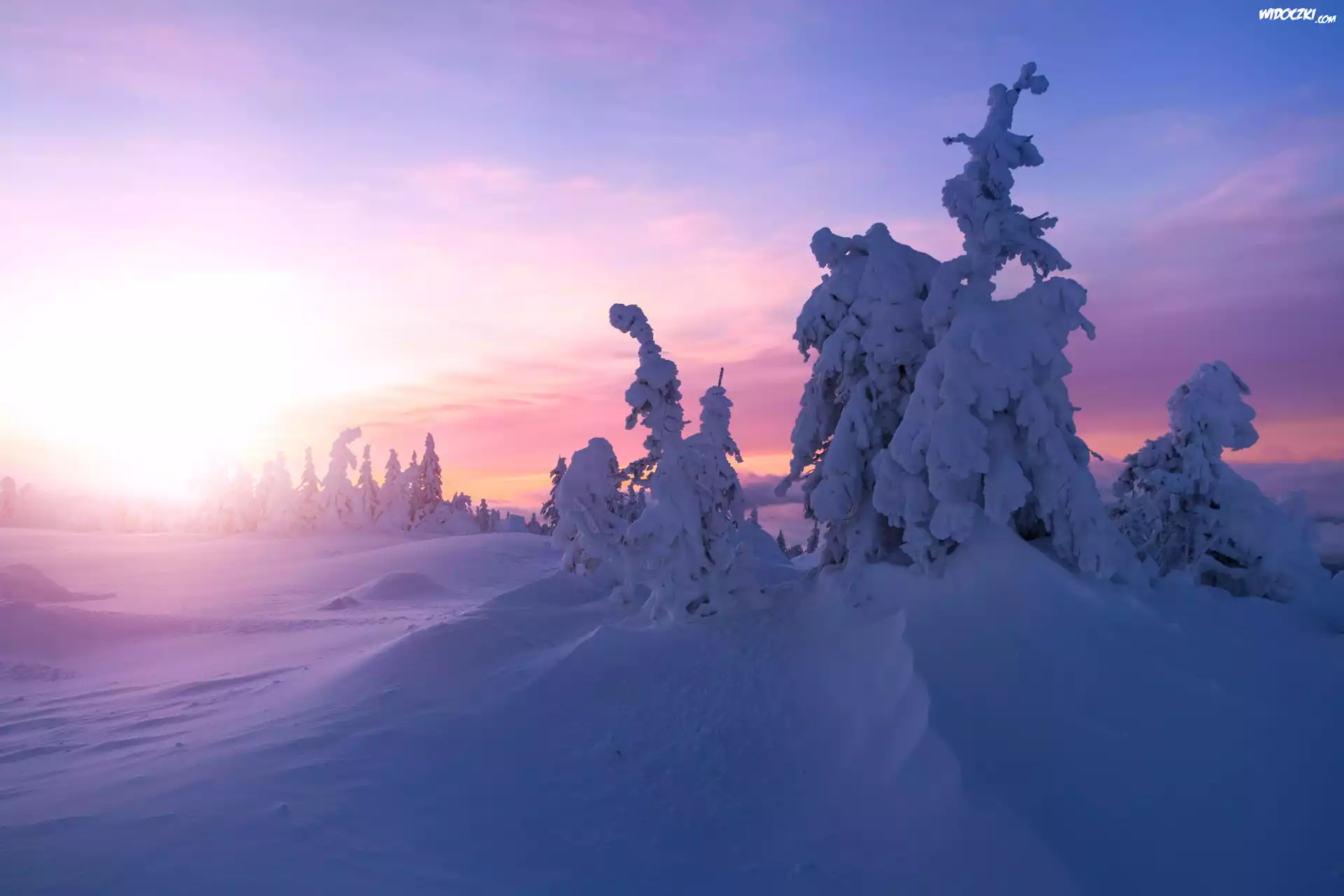 Zima, Ośnieżone, Drzewa, Wschód słońca, Śnieg