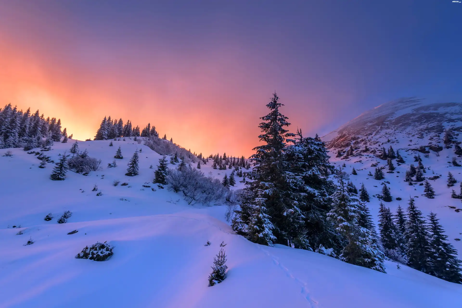 Zima, Góry, Drzewa, Zachód Słońca, Śnieg