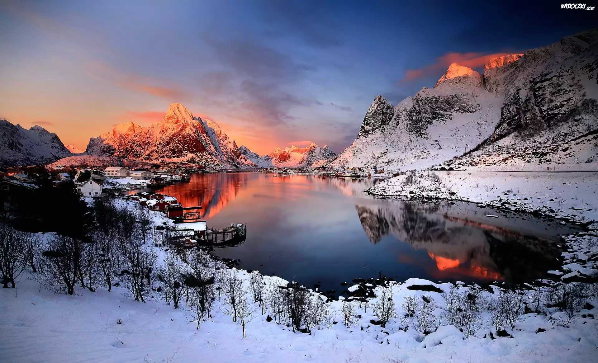 Zdjęcia, Zima, Śnieg, Jezioro, Zachód Słońca, Góry
