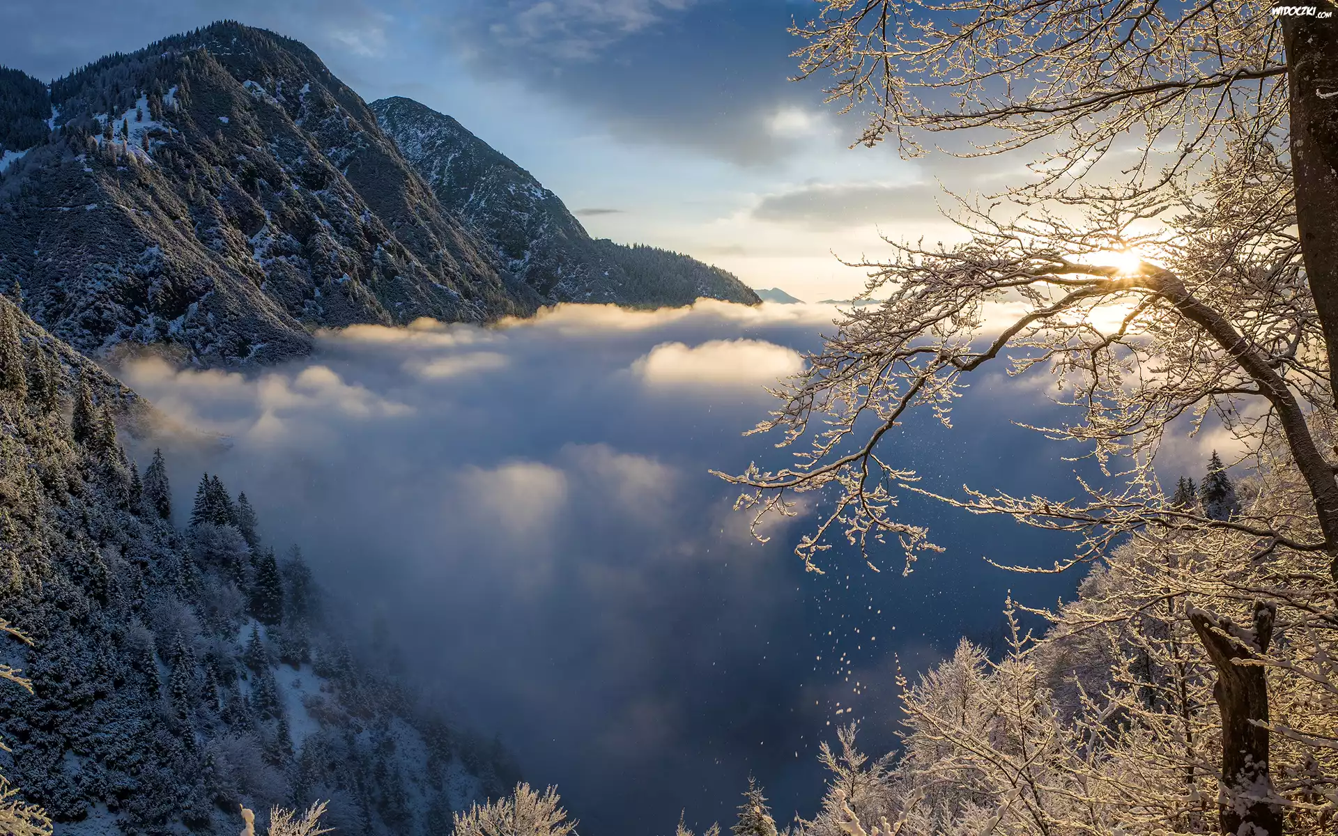 Zima, Góry, Mgła, Wschód słońca, Drzewa