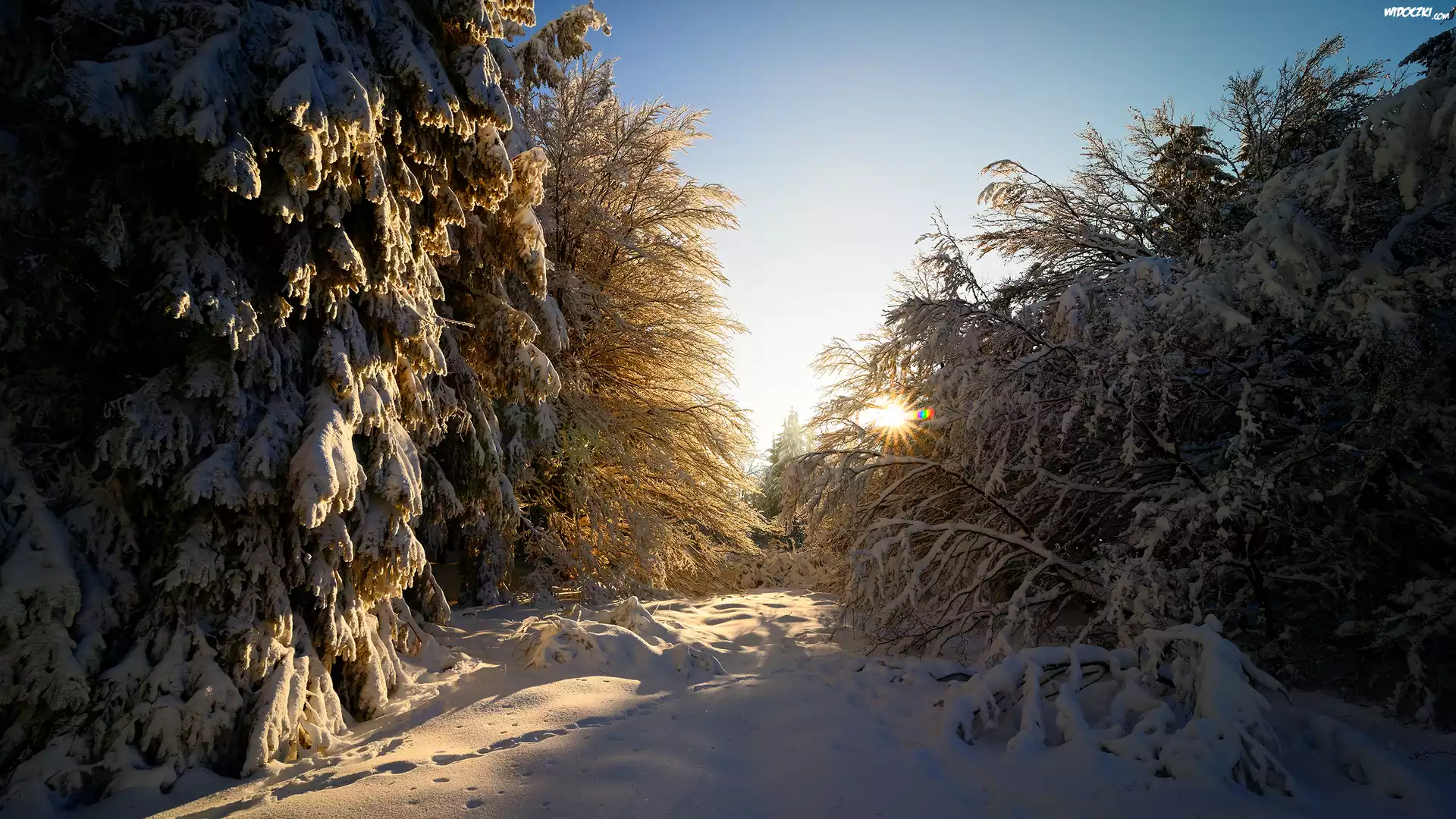 Zdjęcia, Zima, Las, Promienie słońca, Drzewa