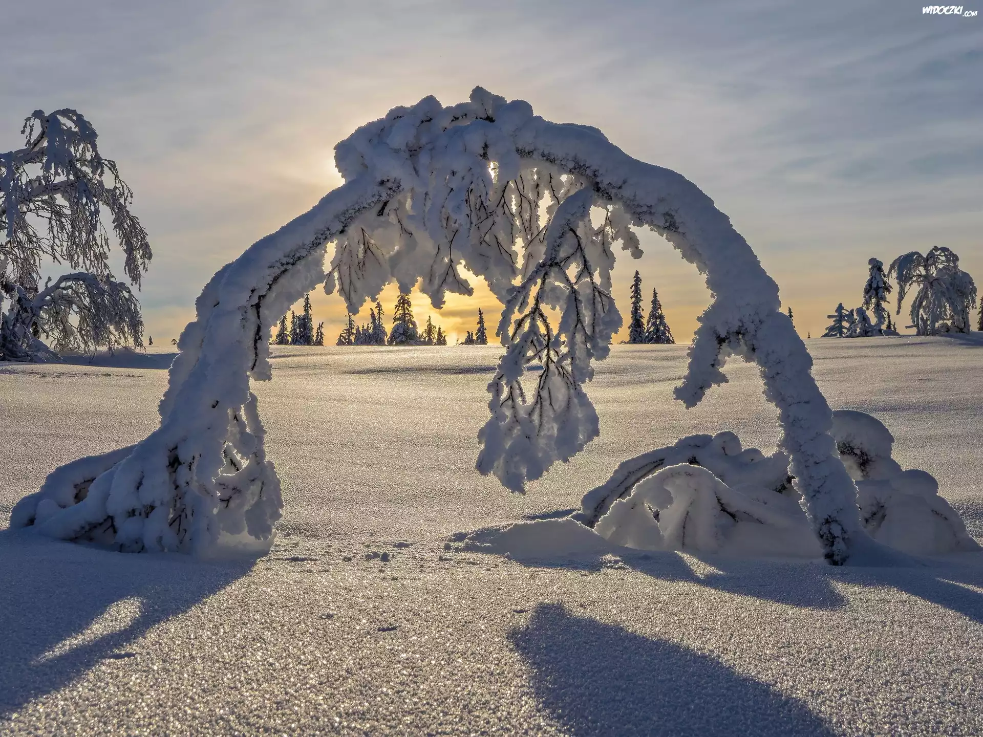 Zdjęcia, Zima, Drzewa, Wschód słońca, Śnieg