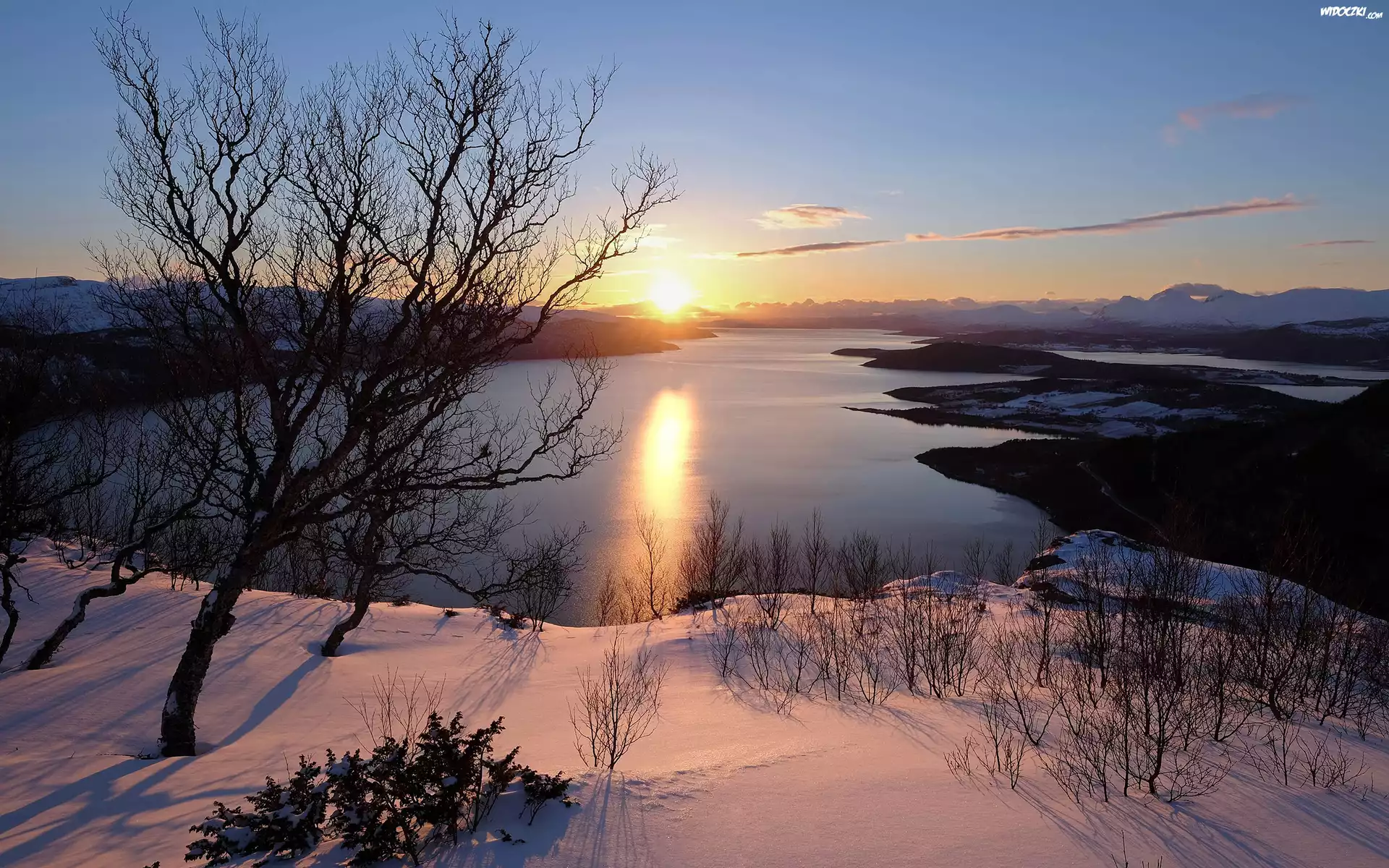 Zdjęcia, Zima, Jezioro, Wschód słońca, Drzewo