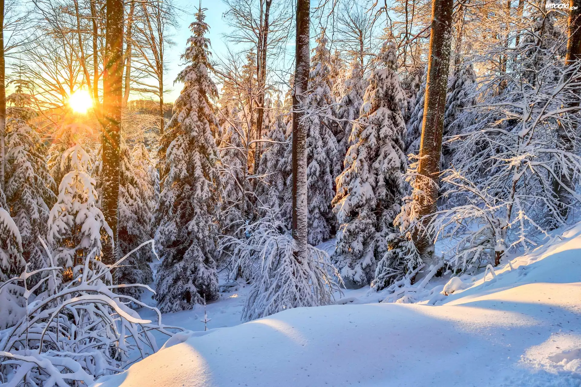 Zdjęcia, Zima, Las, Wschód słońca, Świerki