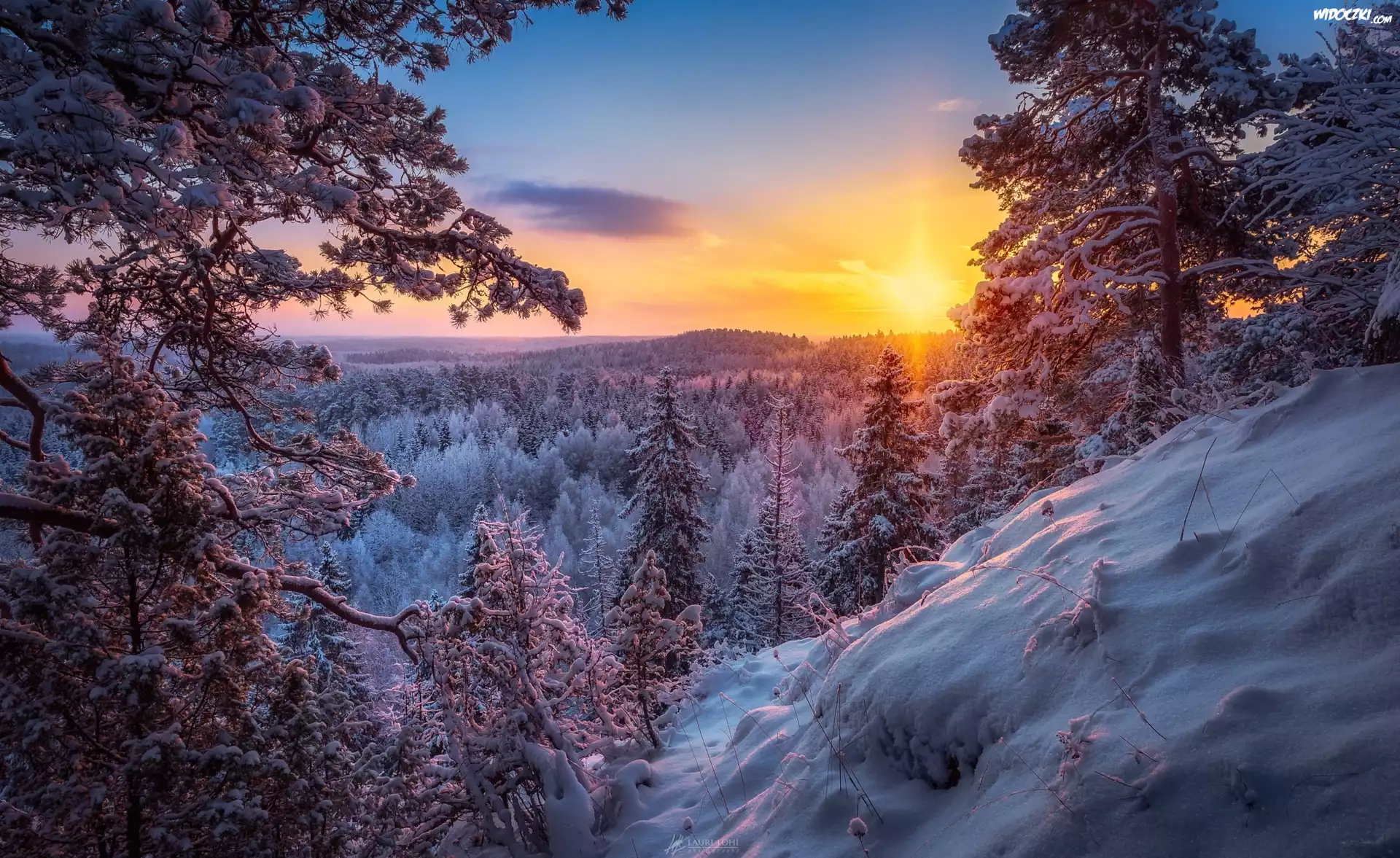 Zdjęcia, Zima, Wschód słońca, Las
