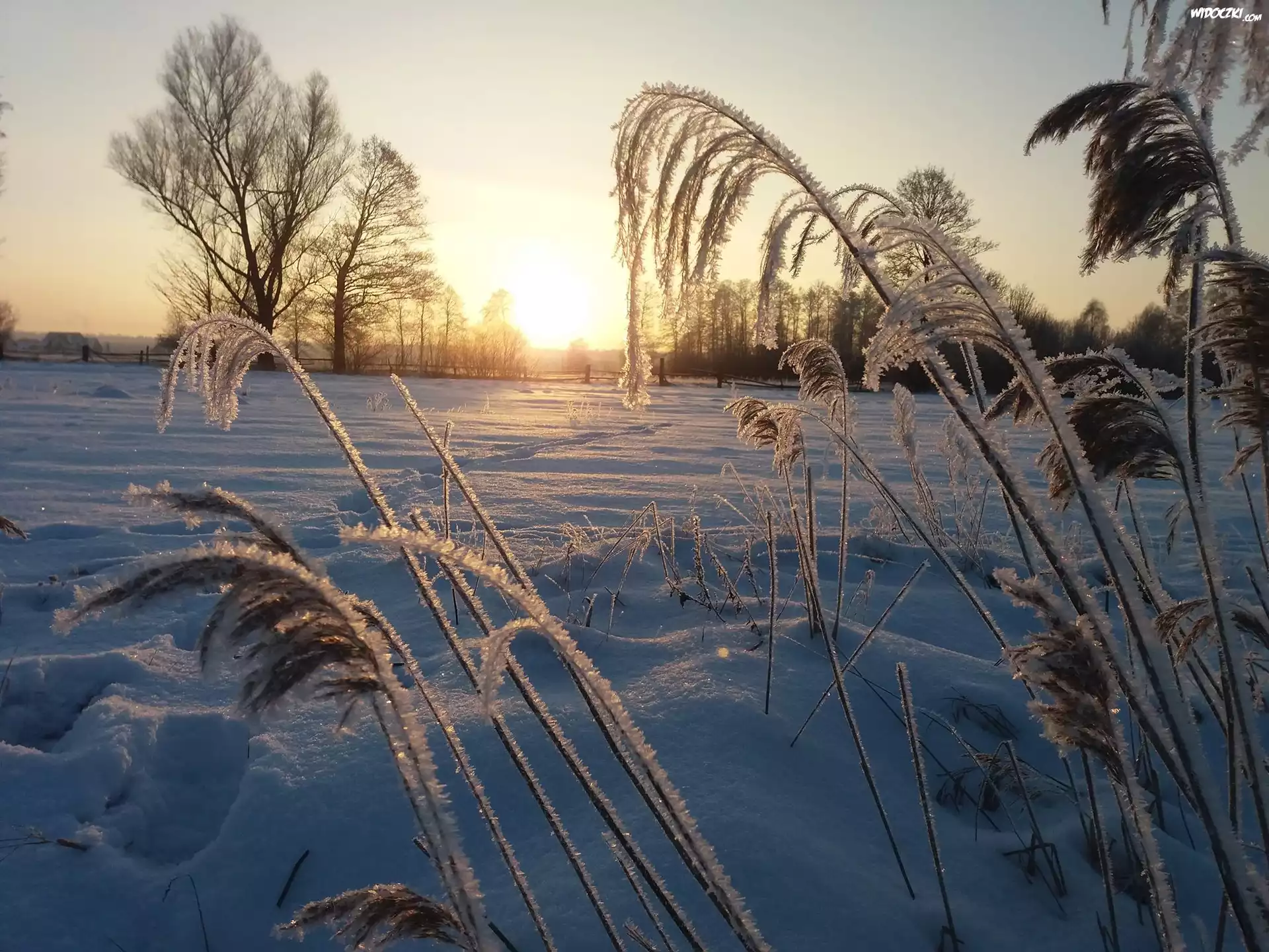 Zdjęcia, Zima, Wschód słońca, Rośliny