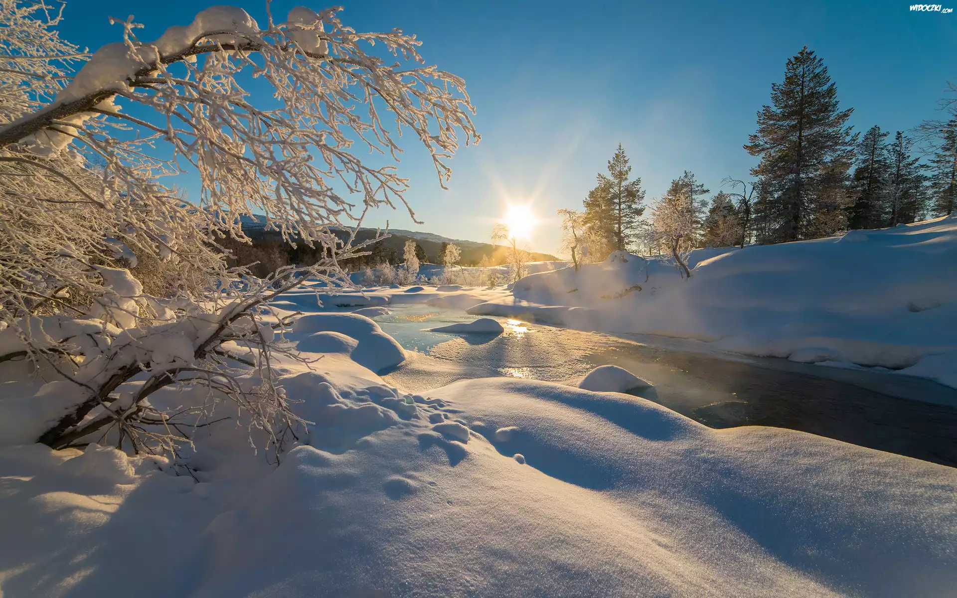 Zima, Rzeka, Wschód słońca, Drzewa