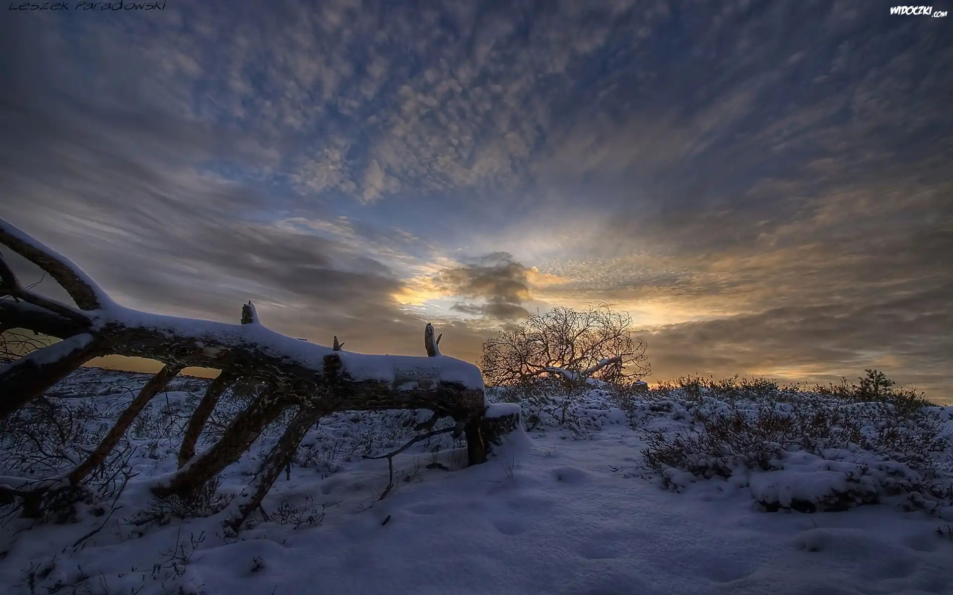 Zima, Chmury, Zachód, Słońca, Drzewo