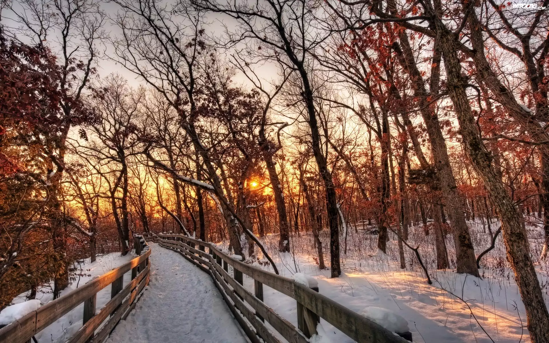 Zdjęcia, Zima, Zachód, Słońca, Drzewa