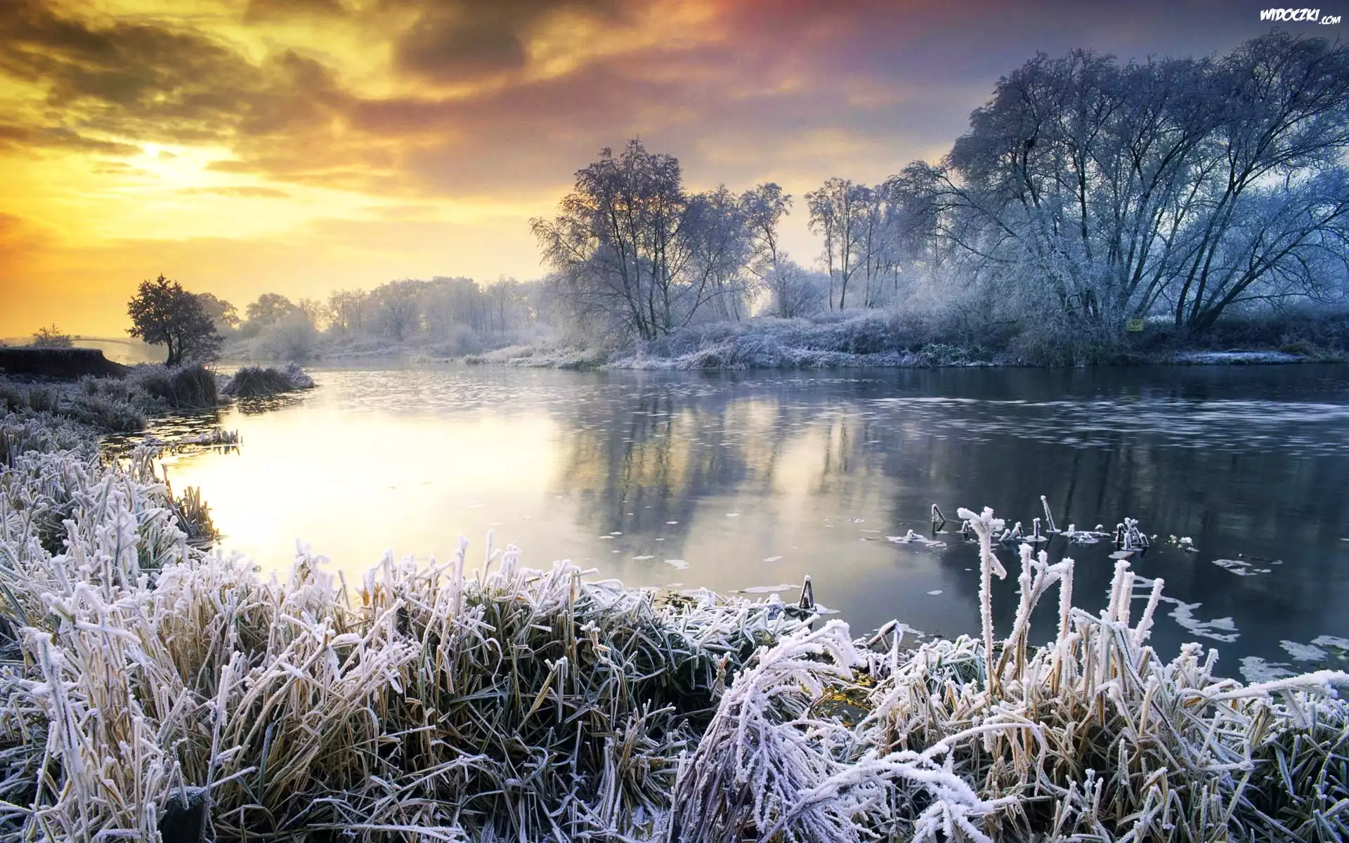 Zdjęcia, Zima, Zachód, Słońca, Jezioro