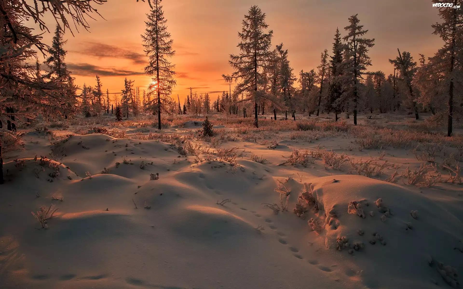 Zima, Las, Zachód słońca, Śnieg