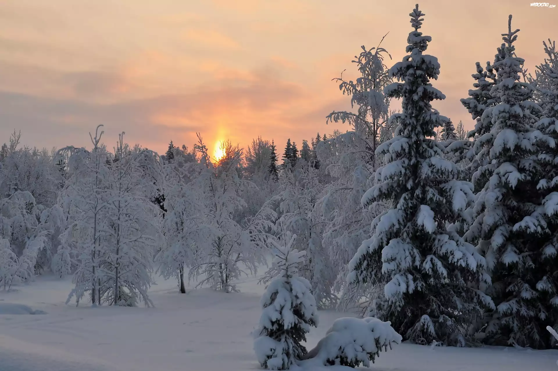 Zdjęcia, Zima, Las, Zachód słońca, Świerki