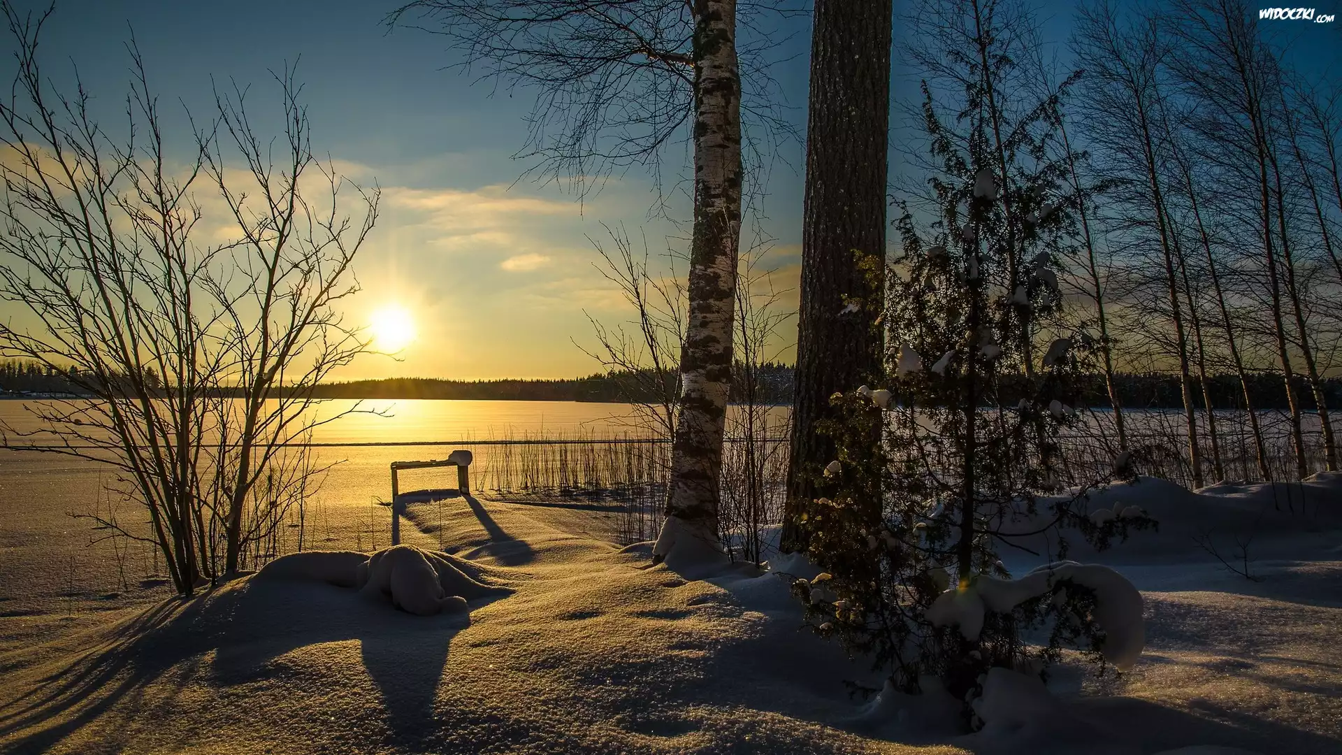 Zdjęcia, Zima, Drzewa, Jezioro, Słońce, Śnieg