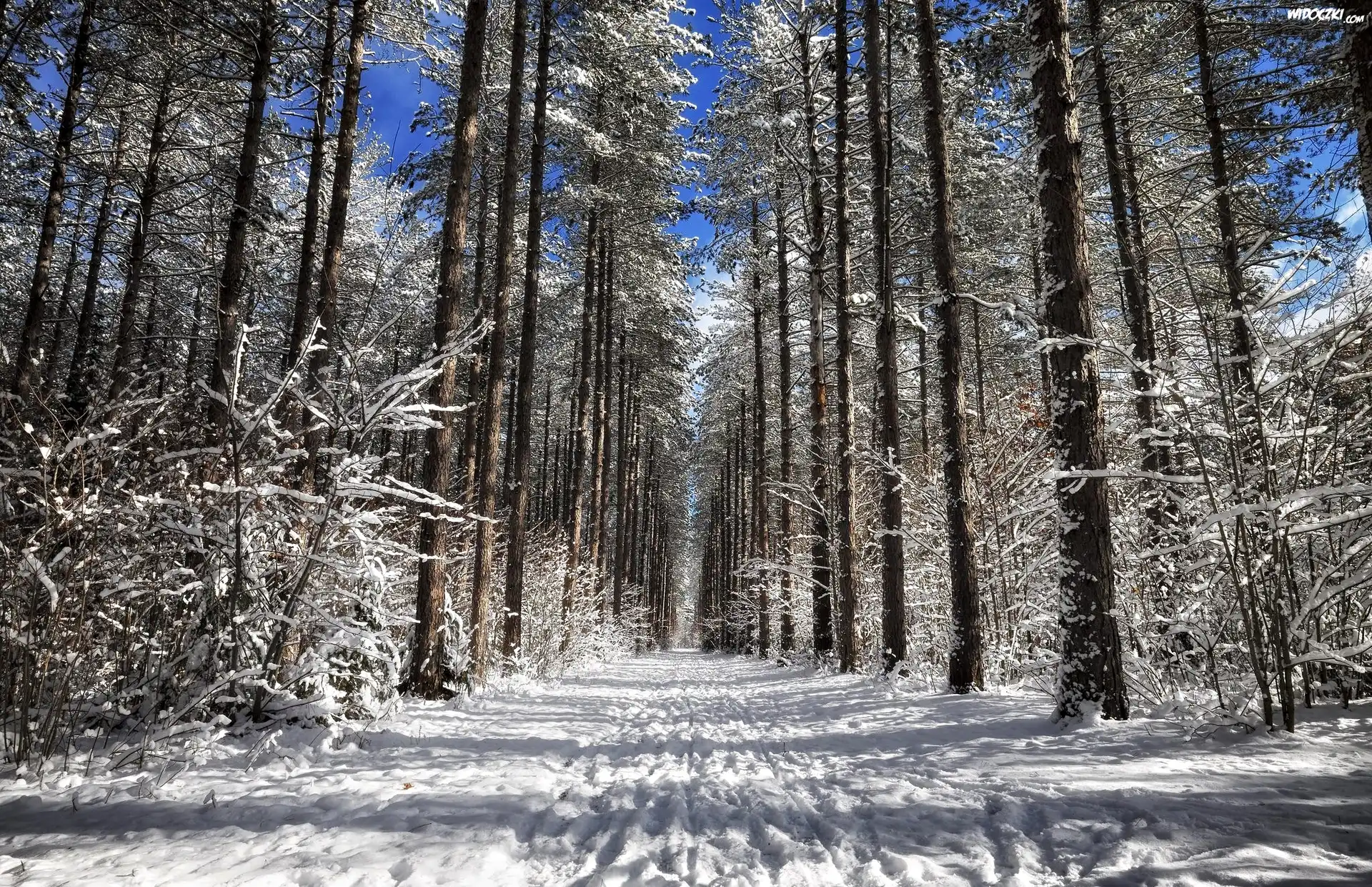 Zima, Drzewa, Droga, Las, Słoneczny, Dzień
