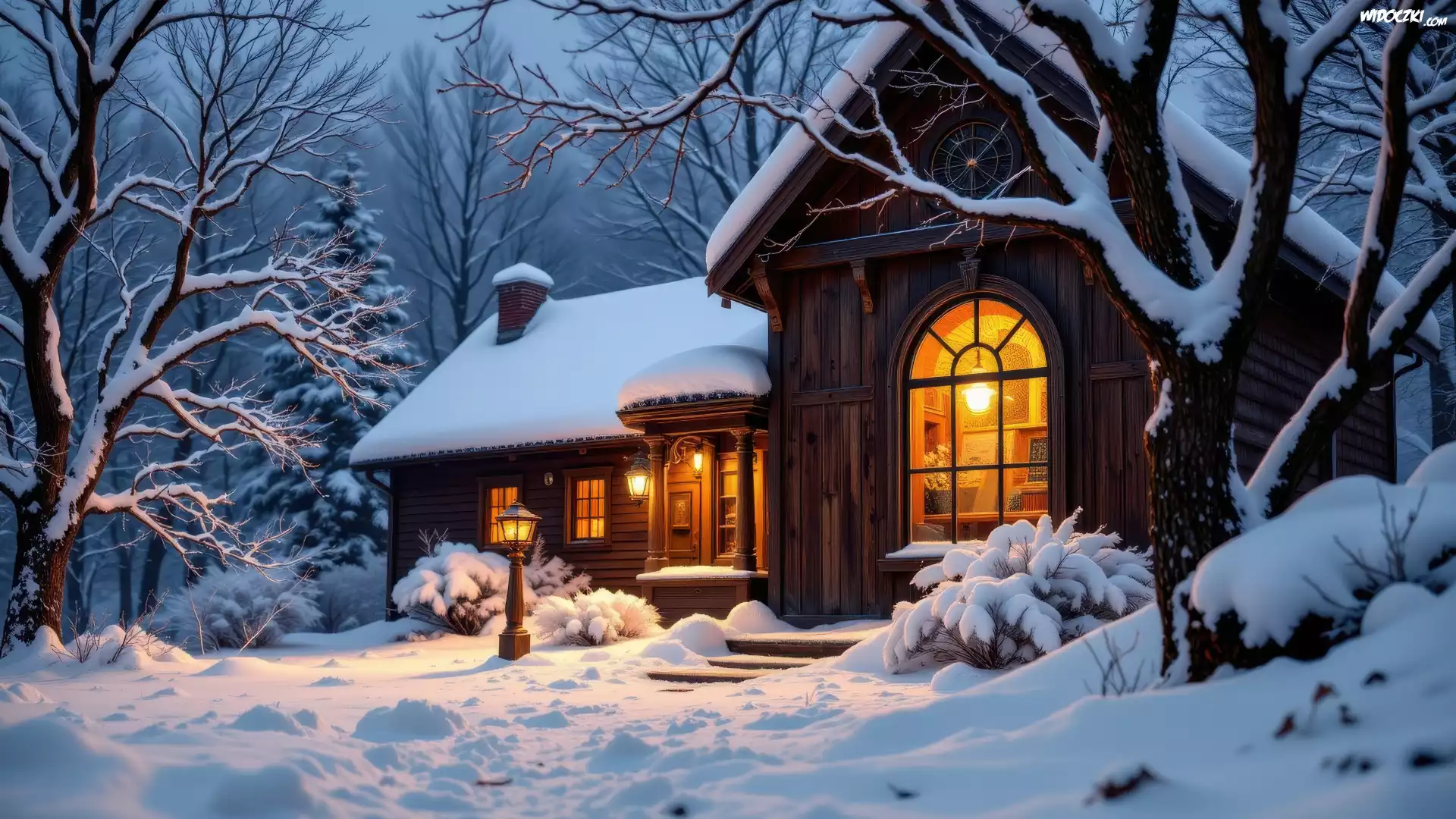 Zima, Las, Drzewa, Krzewy, Noc, Dom, Światła, Latarnie, Śnieg, AI