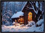 Zdjęcia, Zima, Las, Drzewa, Krzewy, Noc, Dom, Światła, Latarnie, Śnieg, AI