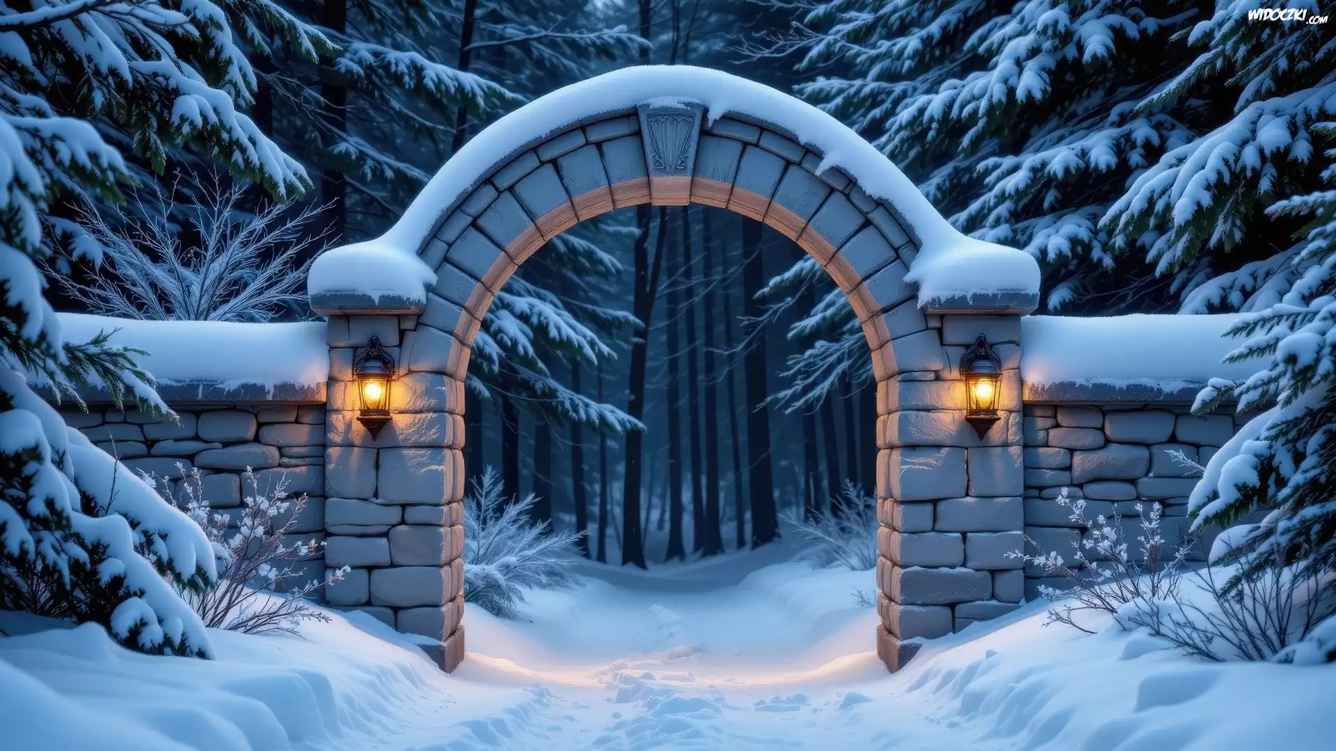Zima, Murowana, Brama, Łuk, Dwa, Lampiony, Śnieg, Ośnieżone, Drzewa
