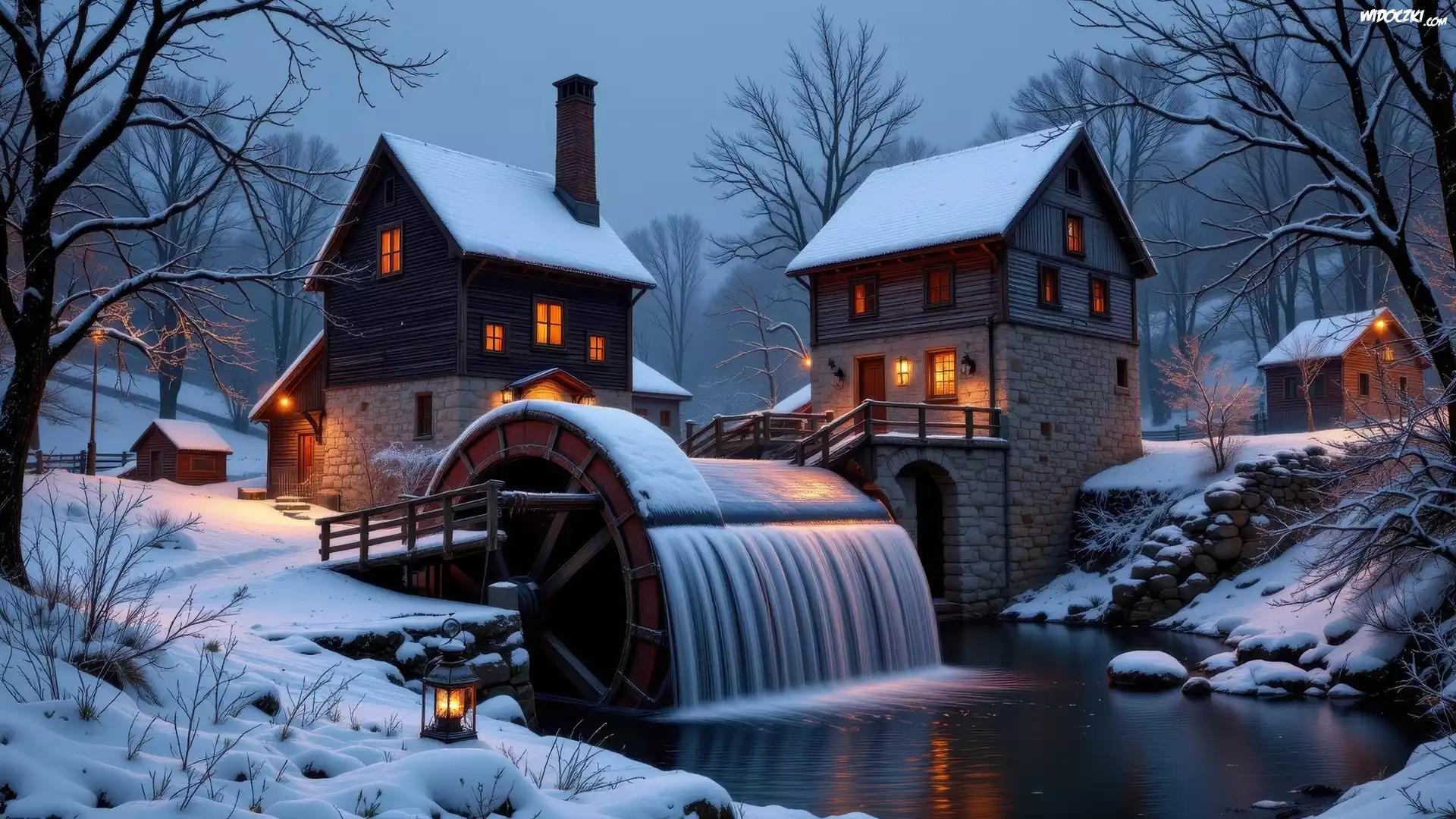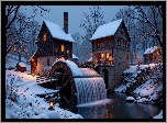 Zima, Noc, Młyn, Wodny, Rzeka, Oświetlone, Domy, Drzewa, Śnieg, AI