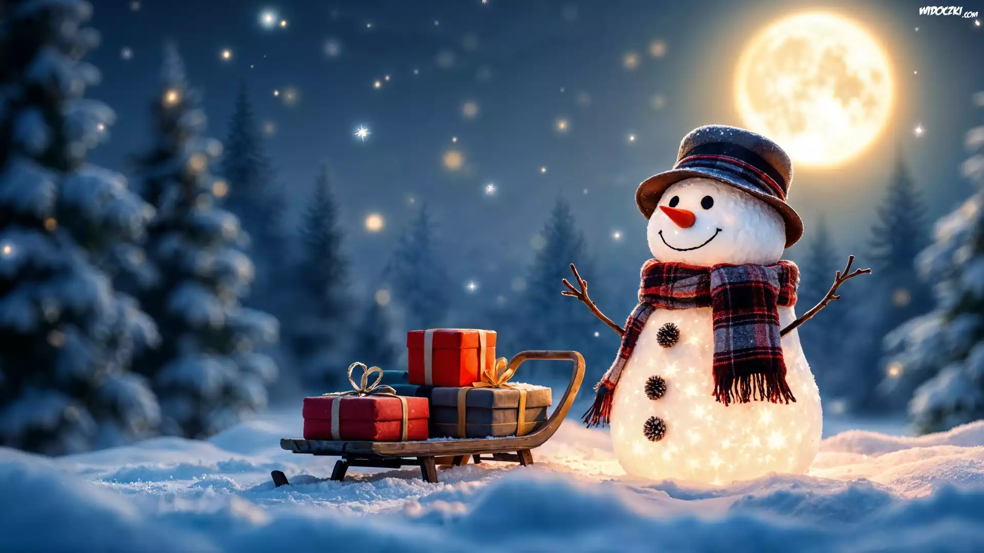 Zdjęcia, Zima, Bałwanek, Kapelusz, Szalik, Sanki, Prezenty, Śnieg, Noc, Księżyc